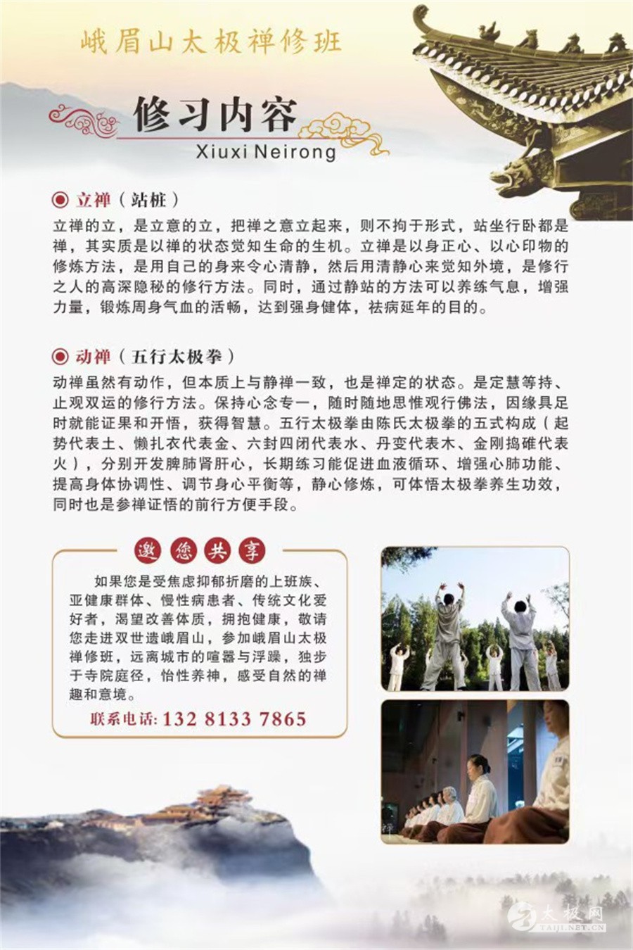 ★修习内容★ 【立禅】(站桩) 立禅之“立”,乃立意之“立”。将禅之意立起,便不拘泥于形式,站、坐、行、卧皆为禅。其本质是以禅的状态感知生命的生机。立禅是一种以身正心、以心印物的修炼法门,借自身之正,令心澄澈,再以清静心觉知外境,堪称修行者高深且隐秘的修行方式。通过静站之法,可涵养气息、增益力量、促进周身气血畅行,进而实现强身健体、祛病延年之目的。 【动禅】(五行太极拳) 动禅虽有动作,本质却与静禅无异,同属禅定之态。它是定慧等持、止观双运的修行方法。修行者保持心念专注,随时随地思维观行佛法,待因缘具足,便能证果开悟,获得智慧。五行太极拳由陈氏太极拳老架一路的前五式构成(起势象征土、懒扎衣象征金、六封四闭象征水、丹变象征木、金刚捣碓象征火),分别调养脾、肺、肾、肝、心。长期练习,可促进血液循环、增强心肺功能、提升身体协调性、调节身心平衡。静心修炼,既能体悟太极拳的养生妙处,亦是参禅证悟的便捷前行之法。 若您是受焦虑、抑郁困扰的上班族,或是处于亚健康状态的人群,亦或是慢性病患者、传统文化爱好者,只要您渴望改善体质、追求健康,都欢迎莅临双世遗峨眉山,参加峨眉山太极禅修班。在此,您将远离城市喧嚣,漫步于寺院庭院,陶冶性情,感受自然与禅的完美交融。 ★时间地点★ 2025年5月1日-4日·峨眉山 报名截止时间:2025年4月25日 ★修习费用★ 1200元/人(包含4天3晚的禅修食宿) 诚挚邀请每一位有缘之人,踏入山林秘境,沉浸于翠绿宁静之中,聆听鸟鸣和音,呼吸纯净空气,拂去职场疲惫,抛却尘世烦忧,静心领略自然的独特神韵。 若欲探寻更多详情,敬请拨打咨询热线:13281337865,我们将为您悉心解答。 |