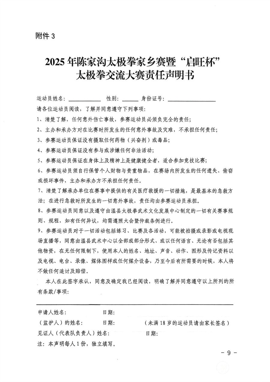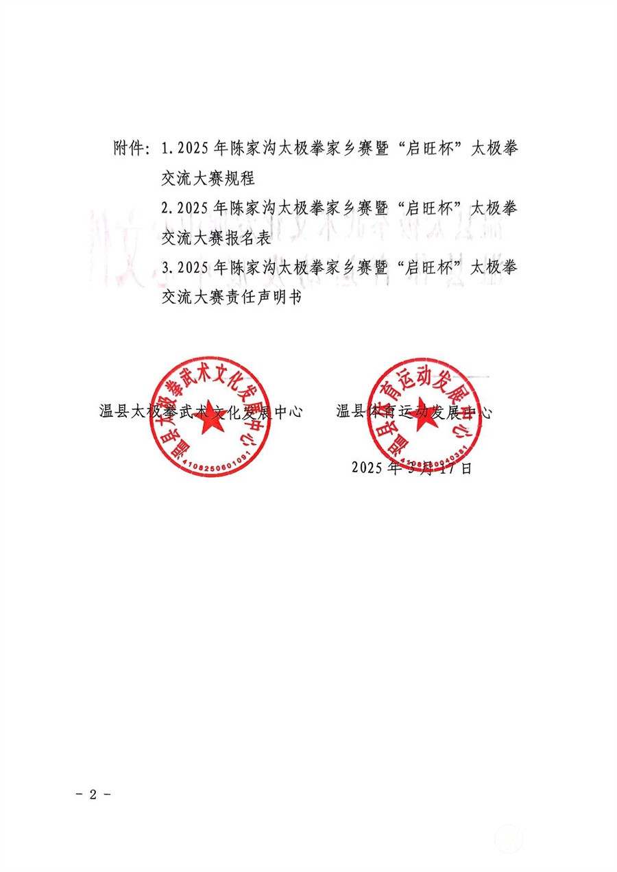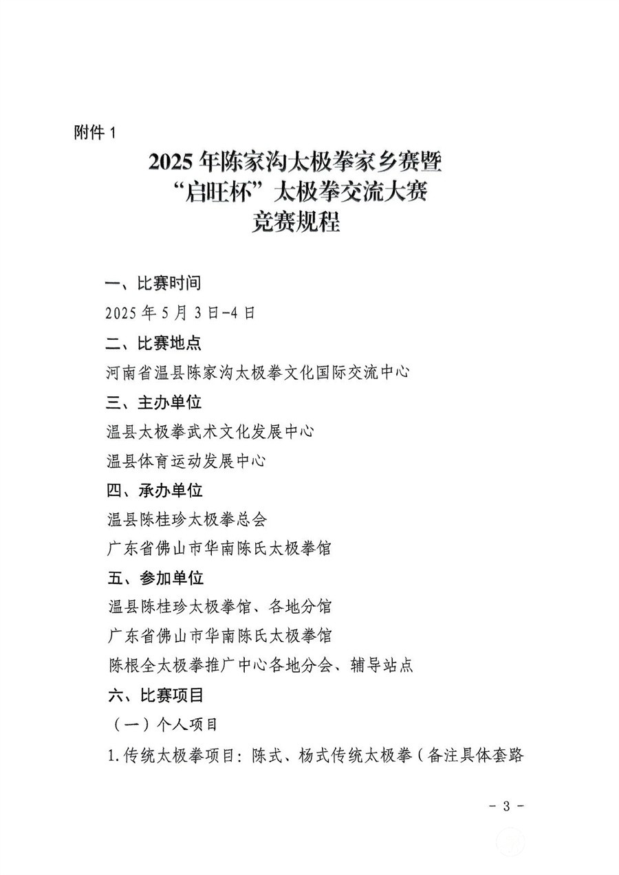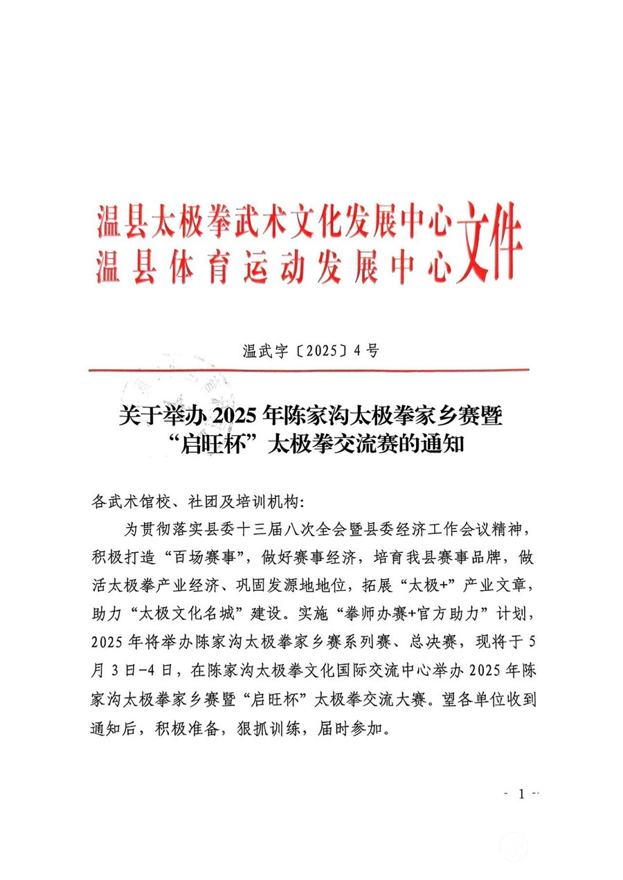 各武术馆校、社团及培训机构: 为贯彻落实县委十三届八次全会暨县委经济工作会议精神,积极打造“百场赛事”,做好赛事经济,培育我县赛事品牌,做活太极拳产业经济、巩固发源地地位,拓展“太极+”产业文章,助力“太极文化名城”建设。实施“拳师办赛+官方助力”计划,2025年将举办陈家沟太极拳家乡赛系列赛、总决赛,现将于5月3日-4日,在陈家沟太极拳文化国际交流中心举办2025年陈家沟太极拳家乡赛暨“启旺杯”太极拳交流大赛。望各单位收到通知后,积极准备,狠抓训练,届时参加。 附件下载: |