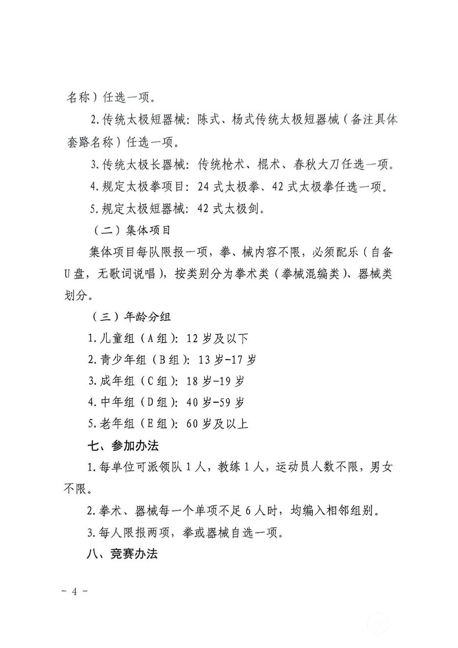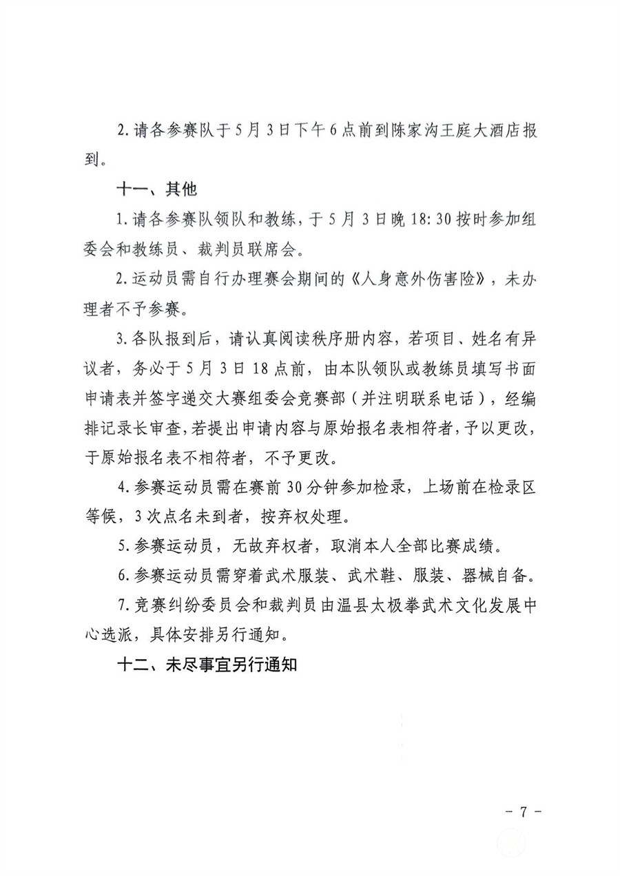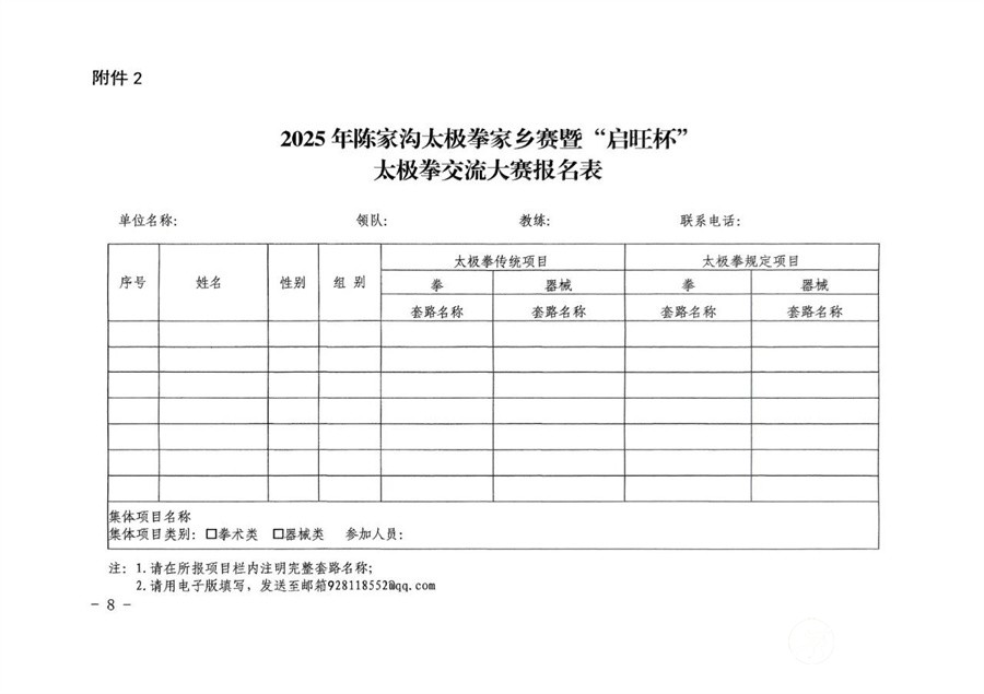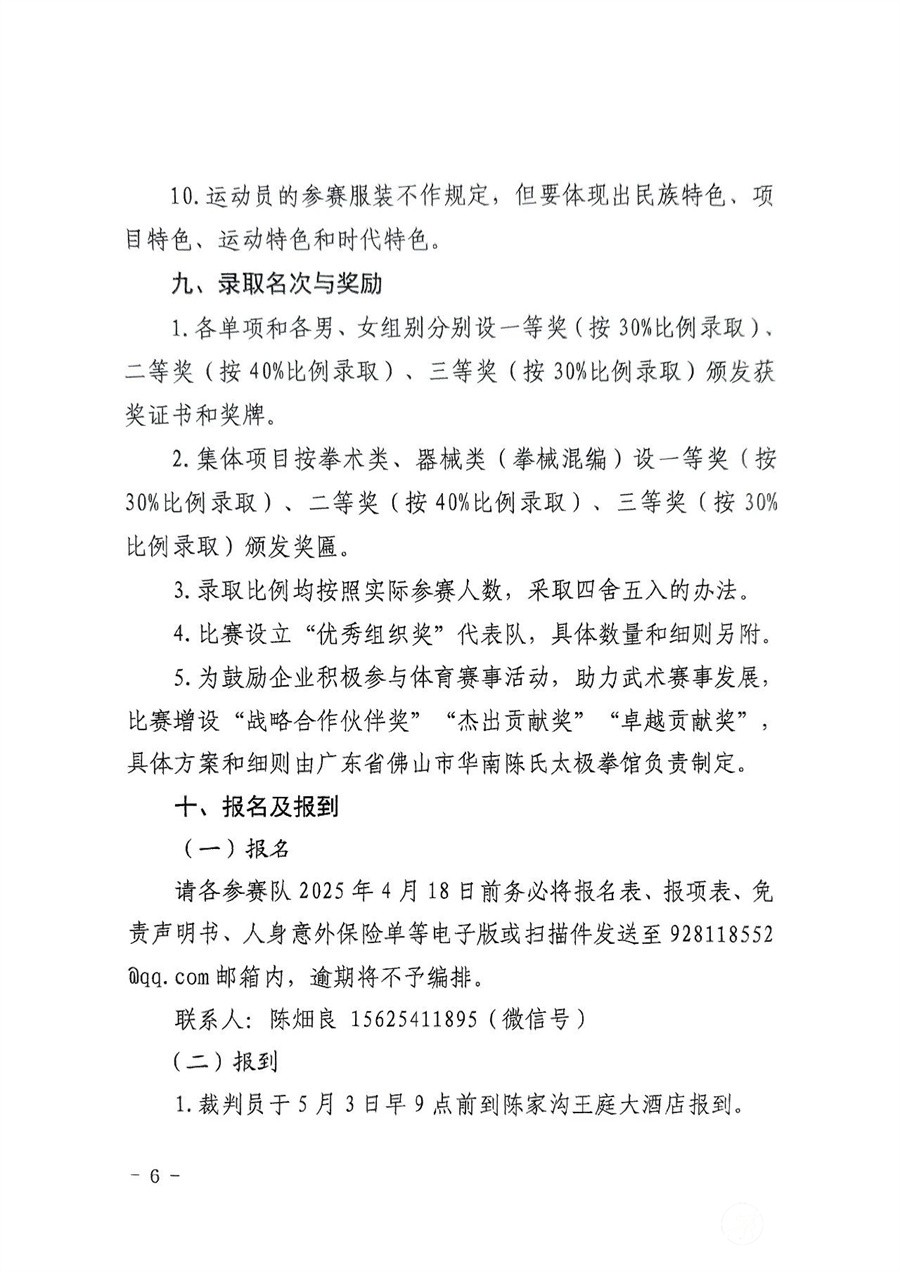 各武术馆校、社团及培训机构: 为贯彻落实县委十三届八次全会暨县委经济工作会议精神,积极打造“百场赛事”,做好赛事经济,培育我县赛事品牌,做活太极拳产业经济、巩固发源地地位,拓展“太极+”产业文章,助力“太极文化名城”建设。实施“拳师办赛+官方助力”计划,2025年将举办陈家沟太极拳家乡赛系列赛、总决赛,现将于5月3日-4日,在陈家沟太极拳文化国际交流中心举办2025年陈家沟太极拳家乡赛暨“启旺杯”太极拳交流大赛。望各单位收到通知后,积极准备,狠抓训练,届时参加。 附件下载: |