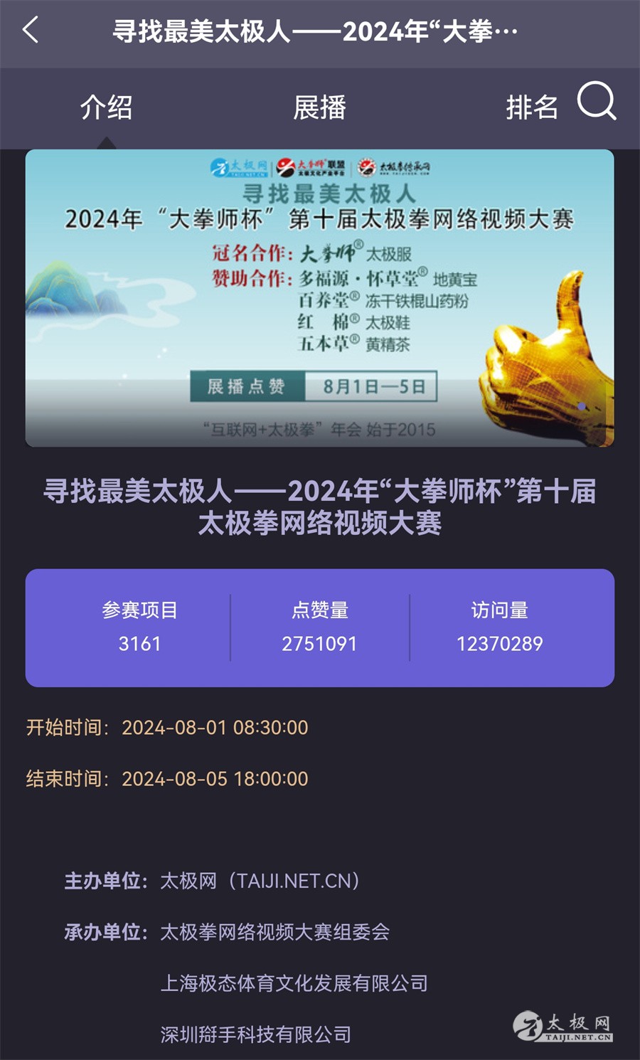太极网旗下品牌赛事活动之寻找最美太极人——2025年第十一届太极拳网络视频大赛即将启动,现诚邀社会各界企业组织冠名赞助“互联网+太极拳”最美年会,携手合作,共赢发展! 一、赛事线上活动概况 太极网作为武术网赛的首创者,于2015年策划发起“寻找最美太极人——首届国际太极拳网络视频大赛”,至今该项赛事已迈入其辉煌的第十一个年头,赛事活动体系不断创新、升级迭代,每届参赛人数已达3000余人,网络浏览量以千万计,2024年“大拳师杯”第十届太极拳网络视频大赛参赛人数4000余人。 被誉为永不落幕的太极拳大赛,无与伦比的网络影响力,居高不下的话题热度,吸引着千万太极人的关注和追捧,已成为旗帜性太极年度盛会。 二、赛事线下活动概况 每年举办线下主题活动颁奖盛典,并包含各流派名家展演、大拳师太极峰会等,2015至2020年每届至少五百余人参会。2023年太极网第九届颁奖盛典在陈家沟“印象·太极”剧场举办,800余人参会。2024年太极网第十届颁奖盛典在温县举行,来自全国各地的700余名各流派拳师拳友参会,共享同鉴“互联网+太极拳”年会的高光时刻。 三、主办方太极网概况 太极网 1997 年创立,作为全球首家太极拳专业网络平台,在创始人刘洪奇和现任总编李超的带领下,深耕太极文化传播与武术产业运营近 30 载。其全媒体粉丝破千万,微信粉丝数百万。 近年来,策划和组织武术文旅赛事活动数十起,千人以上规模十余起。与各地政府、景区、协会等合作打造的中国承德太极拳精英展演大会、丽江国际武术节、三亚国际武术文化旅游节、云台山太极拳交流大赛、敦煌武术文化节等武术活动享誉拳界。 合作网赛部分展示 同时,太极网与多地体育部门、武术组织合作,累计举办武术网络赛事活动百余起,直接参赛人数达30万。 四、赛事活动资源优势 (一)深厚媒体资源:太极网近 30 年积累的专业太极拳资源、良好品牌信誉,与全球拳友、馆校协会合作紧密。 (二)强大赛事 IP:作为太极拳网络赛事开创者,赛事 IP 深入人心,拥有庞大忠实受众群体。 (三)先进赛事系统:自主研发的大拳师赛事系统,融合 PC、H5、微信小程序,私域流量大、定位精准。 (四)成熟宣传体系:大赛宣传周期长,从报名到颁奖典礼全程覆盖。通过建立大赛永久专栏,在各大视频网站同步传播,为企业品牌和产品宣传推广持续赋能。 五、本届赛事预计规模 2025年第十一届大赛预计赛事规模3000人,馆校协会300余家,线下颁奖典礼规模500—800人。覆盖传播太极群体百余万。 六、冠名单位享受权益 冠名合作达成签约后,太极网、大赛组委会对冠名单位回馈如下权益。 (一)赛事命名 与冠名方商榷确定,赛事命名为2025年“XXX杯”第十一届太极拳网络视频大赛,在赛事全部宣传推广及线下主题活动中使用冠名。 (二)广告植入 (1)广告投放:大赛通知及相关软文全网发布宣传,太极网各大网站、微信矩阵、自媒体、手机APP等,突出冠名单位宣传。 (2)微信圈:报名邀请函、代言视频、拳师海报、名家展演视频等系列图片视频植入冠名单位,通过广大拳师朋友圈刷屏推广。 (3)片头片尾广告:全部参赛视频片头片头可加15秒以内广告及字幕展示。 (4)展播平台:在大赛展播平台及全部参赛视频选手个人页面植入广告图,网络访问量预计2000万+。 (5)太极网建立大赛专栏永久展播视频。 (6)其他宣传。 2018年“怀山堂杯”第四届大赛展播宣传 (三)荣誉授予 太极网、大赛组委会向冠名单位授牌“战略合作伙伴”,聘任单位领导为组委会名誉主任,并作为主要嘉宾参加大赛相关主题活动。 (四)展位营销 冠名单位将获得大赛期间所有宣传资料、纪念品的优先展示权,大赛颁奖典礼提供主要位置摆放展板、横幅宣传及营销展位等。 (五)媒体采访 太极网围绕冠名单位品牌故事做专题报道并全网推广。 (六)资源对接 太极网居中协调建立合作平台和机制,为冠名单位推介有价值的资源,冠名单位代表将受邀出席大赛活动,与众多拳师及馆校协会交流合作。 七、具体冠名合作方案可根据赞助方需求及实际情况进行磋商,适度调整和优化。 太极网 太极拳网络视频大赛组委会 2025年6月 |