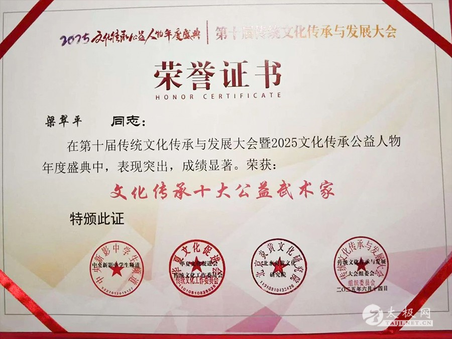 2025年6月14日,第十届中国传统文化传承与发展大会暨 2025 文化传承公益人物年度盛典在北京全国人大会议中心举行。此次活动由中央新影中学生频道、华夏文化促进会传统文化工作委员会、中国台港电影研究会华语电影宣传发行委员会联合主办,吸引了来自众多专家学者、企业家、文艺工作者等社会各界精英共襄盛举。 作为陈氏太极拳第十二代优秀传承人、北京市西城区马虹陈氏太极拳奇石馆辅导站站长梁翠平受邀出席并发表题为《赓续太极文脉 勇担传承使命》的演讲。她结合多年实践,阐述太极哲学与传承责任,分享了对传统武术文化的理解与感悟,获得现场观众认可。
