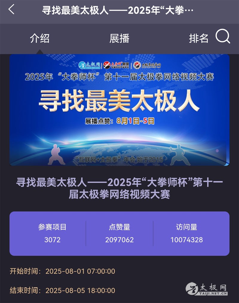 8月5日下午6时整,备受瞩目的寻找最美太极人——2025年“大拳师杯”第十一届太极拳网络视频大赛展播点赞活动成功收官。经过5天的激烈角逐,全球太极拳爱好者共同见证了这场“互联网+太极拳”的年度盛会。 规模持平往届高纪录,太极拳爱好者共襄盛举 本届大赛延续了往届的火热态势,参赛人数和作品数量持平往届高纪录。自启动报名以来,仅一个多月时间,全球参赛选手达近4000人,团队报名数量增长至300多支,最终精选符合参赛的作品3072个进行展播。在广大太极拳爱好者的支持下,“互联网+太极拳”的影响力持续扩大,成为全球太极拳爱好者交流的重要平台。 展播点赞燃爆全网,互动量破纪录 本次大赛展播点赞活动于8月1日正式启动,截至8月5日收官,平台累计浏览量突破1007万次,投票点赞数高达209万次,全球太极拳爱好者热情参与,连续5天刷屏社交网络,掀起一股“太极热”! 权威评审即将启动,名家坐镇保障公平 深耕太极文化传播推广近30载的太极网自2015年首创“互联网+太极拳”赛事模式,至今已连续举办十届,成为全球太极拳网络赛事的标杆。接下来,大赛将进入专家评审阶段,组委会特邀各流派太极拳名师名家、专业裁判组成评审团,对所有参赛作品进行严格打分,并提供专业点评和建议。 颁奖盛典即将揭晓,线下活动敬请期待 大赛评审结束后统一公示成绩,届时大赛组委会将依照惯例举办颁奖典礼等线下主题活动,具体通知择日发布。期待拳友们以网会友、以武会友,交流、交心、交朋友,让“永不落幕的太极拳大赛”伴随广大太极人在太极大道上一路同行。 最佳人气奖 王莉 陈祖科 金湛棋 步伟光 侯顶先 最佳人气团队 普宁广场养生太极队 海南开放大学社区教育学院太极拳一班 四川省南充市龙华真源太极中心 太极网 太极拳网络视频大赛组委会 |