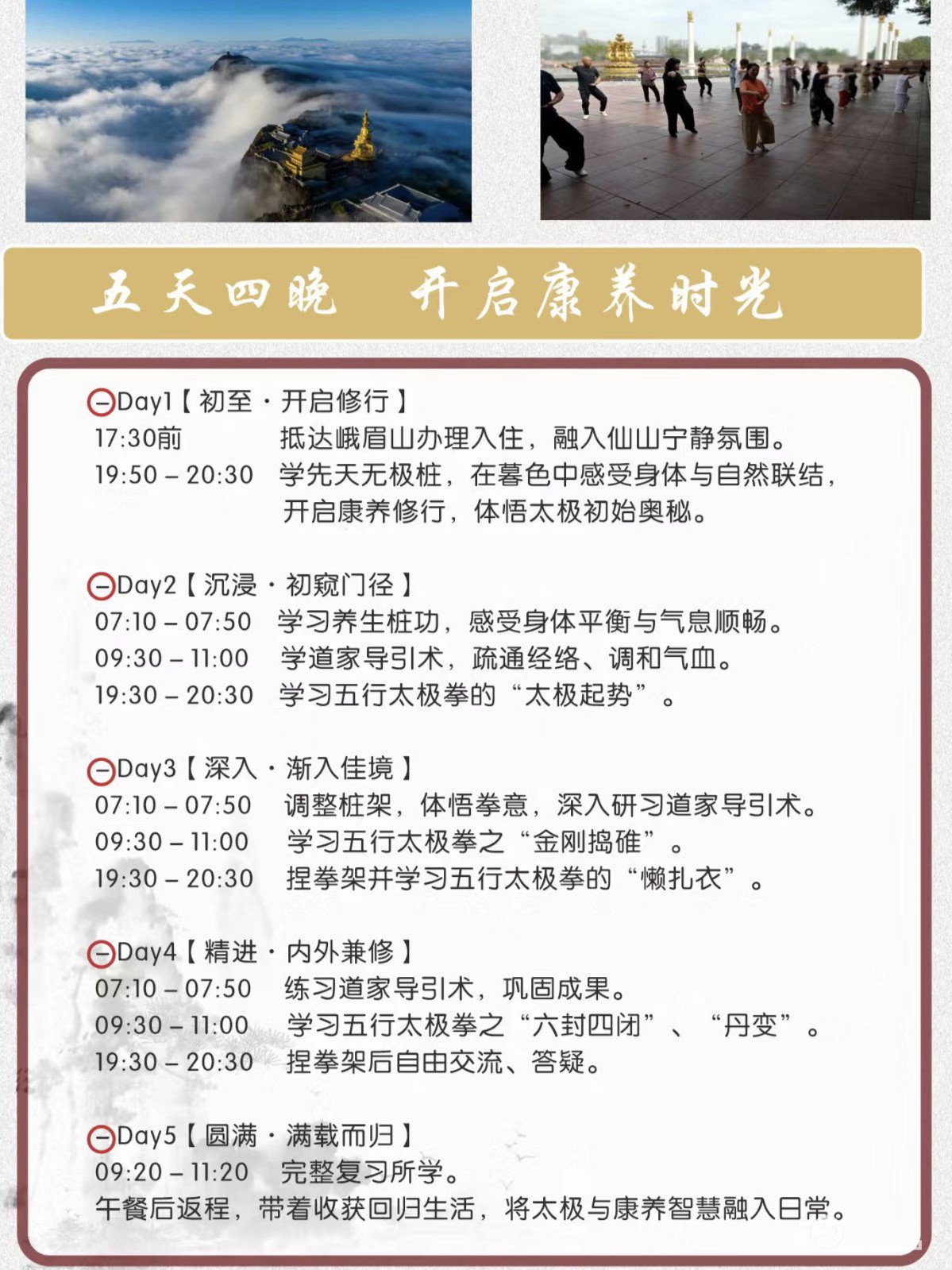 十月的峨眉山,夏绿渐退,秋景斑斓。晨露缀红叶,古寺钟声悠远,暖阳下山林沉静。这座千年仙山融自然灵韵与禅意,气场宁静,是都市人远离喧嚣、滋养身心的佳处,更是国庆出游的绝佳选择——既能在太极中沉淀身心,亦可深度领略仙山风光。国庆不妨暂别繁杂,来此在钟声中沉淀,于山林习练太极,更能畅游胜景,让身心重归宁静平衡的同时,收获一路好风光。 ★资深名师亲授,传承正统功法 本次培训由温县陈家沟历史文化研究会太极拳术推广委员会副主任陈波亲授。陈老师为陈氏太极拳第十二代传人、国家二级拳师,深耕太极四十余载,功底深厚、教学经验丰富,善将传统太极哲学与现代康养理念结合,教学深入浅出,已指导超万名学员改善体质、调节情绪,广受好评。 ★培训内容 太极养生桩:太极拳重要基础功法,通过调控姿势、呼吸与意念,以静站练习滋养气息、增强力量、畅通气血,从而强身健体、调节身心、祛病延年,还能提升协调性、改善循环、平静心绪,适合各年龄段日常养生。 道家导引术:道家代表性养生功法,以“导气令和,引体令柔”为核心,通过调姿势、呼吸与意念,配合肢体屈伸扭转等动作引导“气”运行,可调和气血、舒展筋骨、平衡脏腑,兼具强身祛病、宁心养神之效,体现“天人合一”理念,适合各年龄层日常调理身心。 五行太极拳:源自陈氏五式(起势属土、懒扎衣属金、六封四闭属水、丹变属木、金刚捣碓属火),以五行学说为基,融生克、招式与气血运行成体系。对应脾肺肾肝心,循生克之道,重“以意导气,以气催形”与内外兼修,强调身心与自然协调,练之可促循环、强心肺、提协调、调平衡、养心神,融养生、健身与技击,适合各基础练习者。 本次课程为精品小班,限招10人,确保一对一辅导。无论零基础、上班族、需调理身体者或传统文化爱好者,都能找到适合节奏,收获专属身心滋养。 ★身心同修+仙山畅游,激活生命能量与旅途乐趣 太极拳不仅是古老武术,更是千年身心养生智慧的结晶: - 生理调节:动作柔和缓慢,能疏通经络、调和气血,改善肩颈腰背酸痛、失眠乏力等亚健康问题,提升免疫力,让身体充满活力。 - 心理疗愈:练习中“以意领气、以气驭形”,需专注动作与呼吸,可舒缓焦虑压力,培养从容心态,达“心静自然安”之境,让内心平和。 - 平衡协调:通过站桩、导引等增强柔韧性与平衡感,延缓身体机能退化,焕发青春活力,让人更自信面对生活。 同时,峨眉山的秋日盛景等你来赏: - 经典地标打卡:课余可前往金顶,看云海翻涌、佛光乍现,在十方普贤像前感受庄严;漫步清音阁,听双桥清音、看翠谷流泉,让山水之美浸润心灵。 - 秋日限定风光:沿山路而行,看漫山红叶与苍松翠柏相映,拾级而上时邂逅山间猕猴,在古刹周边感受“禅意与秋光共生”的独特意境,随手一拍都是秋日大片。 - 人文体验:探访万年寺、报国寺等古刹,听僧人讲经、看香火袅袅,在千年佛教文化中沉淀思绪,让旅途既有自然之趣,更有人文之韵。 ★太极与道,山林为友,旅途相融 - 晨曦初照:于峨眉山麓站桩,观晨光穿雾、听鸟鸣,在千年佛地气场中感悟“天人合一”,与自然相融。 - 上午时光:随导师在林间研习太极拳架,导师传授心法、呼吸技巧及养生秘诀,小班细致指导,探索太极奥秘。 - 午后至傍晚:专属旅游时光,可自主畅游峨眉山核心景点,或在古寺禅房品禅茶解乏,沿山间小径漫步,呼吸清新空气、赏层林美景,体悟宁静与旅途的双重惬意,放松心灵。 ★报名费用及优惠 - 标准费用:1600元/人,涵盖课程费、食宿费用,让您无后顾之忧,专心享受“康养+旅游”的双重旅程。 - 组团特惠:3人及以上组团报名,同享8.5折优惠,与亲朋好友共赴太极康养与仙山畅游之约,还能节省费用。 这个国庆,别再于人潮中忙碌奔波。来峨眉山,在千年气场滋养下,让古老太极拳为您疏通经络,让山林清风带走疲惫,让秋日盛景填满旅途,让静谧时光唤醒对生活的热爱。仙山圣境已就绪,“康养+旅游”之旅虚席以待,诚挚邀您以太极之名,赴这场身心与风光的双重修行之约。 报名途径 因国庆峨眉山酒店及景区接待紧张,课程报名截止9月23日,额满即止。有意者加微信13281337865,注明“峨眉山太极养生班报名 - 姓名”,抢占席位。课程时间2025年10月1日 - 5日(五天四晚),限10人,先到先得。 |