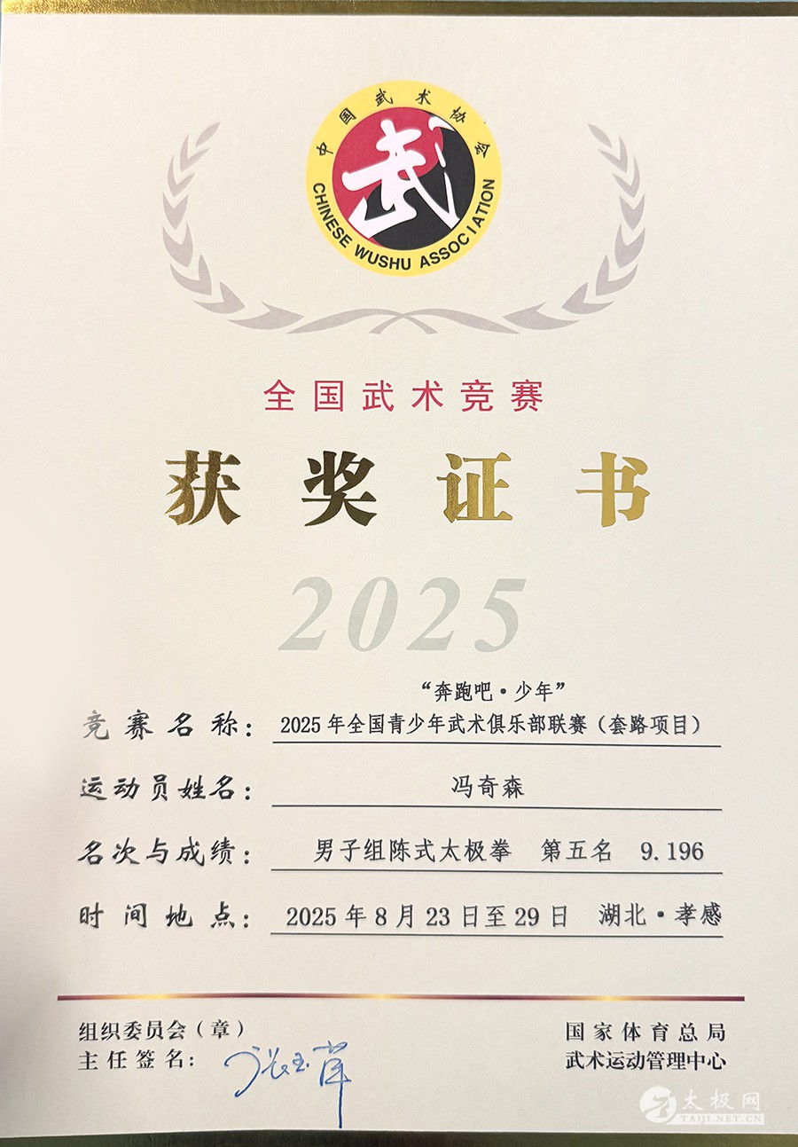 2025年8月23日至29日,由国家体育总局武术运动管理中心、中国武术协会举办的 “奔跑吧·少年”2025年全国青少年武术俱乐部联赛(套路项目)在湖北省孝感市火热举行。本次赛事规模宏大,吸引了来自全国各省、自治区、直辖市327个参赛队伍的2490人报名参赛,共同展现中华武术的独特魅力。 在备受关注的陈式太极拳比赛中,由温县陈正雷太极拳馆馆长党绍静和总教练陈淇带领的参赛队伍表现突出。该馆选送的少年选手李浩阳以9.356分的优异成绩荣获全国第二名,冯奇森以9.196分取得全国第五名。凭借此次出色表现,李浩阳成功获得"国家一级运动员"称号,冯奇森荣获"国家二级运动员"称号。 温县陈正雷太极拳馆自2009年成立以来,在党绍静等教练团队的努力下,培养出了大批优秀学员。党绍静作为陈氏太极拳第十三代传人、河南省一级拳师,不仅自身武艺精湛,还长期致力于太极拳教学与推广工作。此次学员在全国大赛中取得优异成绩,正是该馆教学成果的有力见证。 据悉,该项赛事是我国青少年武术俱乐部最高水平的联赛之一,旨在促进青少年武术运动的普及与发展,发现和培养优秀武术后备人才。期待未来有更多像李浩阳和冯奇森这样的优秀选手在武术赛场上绽放光芒,传承和弘扬中华武术精神。 责编:小田 |