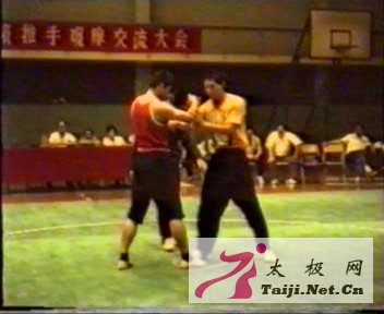 1993年王战军(右)与黄康辉 黄康辉这个名字,王战军如雷贯耳。当初,他与朱金钟交手,久久不能取胜,而朱金钟得两届全国推手赛第二名,都是输给了黄康辉。朱金钟说,黄康辉太厉害了,尤其一招野马分鬃式,刁住对方手腕,上步,顺势捋加掤劲,神仙也防不住!绝了!黄康辉是王战军心目中的英雄,崇拜的偶像,他盼望有一天能像黄康辉那样,夺取全国冠军,名扬四海。 现在,黄康辉就站在他的对面,在中国太极拳推手比赛的最高殿堂上,他就要与自己心目中的英雄一决高下了。他有点儿兴奋,涌动着一种战而胜之的强烈愿望!父亲说了:“黄康辉没什么可怕,你完全可以打败他。” 比赛规则:一方进攻,一方防守,时间一分钟。然后攻防互换。防守方不得进攻。 黄康辉首先进攻。他上来就拿出了看家本领野马分鬃式,想给对手一个下马威。可是,朱金钟说的这个神仙也防不住的厉害招法,在王战军身上没有奏效,他步走方位,一滑而过。黄康辉劲力落空,就在两人身体相触的一刹那间,王战军胯部只一抖,黄康辉跌倒在擂台上。 “哗哗哗……”全场观众报以热烈的掌声。然而,裁判判双方互不得分。 “如此精妙的太极弹抖功夫,为什么不给防守方得分?”总裁判长、德高望重的太极拳大师李秉慈要求改判。王战军得了3分。此后黄康辉心有忌惮,不敢贸然发力,他这一分钟没有建树。 该王战军进攻了。他抓住黄康辉的手臂,向下一捋,黄康辉忙做松沉势,意在缷去对方力道。一看黄康辉劲向下走,机不可失!王战军一拍他的肩膀,二力合一,黄康辉立脚不住,一头载翻。起来再战,黄康辉似乎乱了方寸,王战军一引,上步,肩膀一动,迎门靠!黄康辉身 不由己,跌出圈外。 比赛未完,黄康辉弃权。王战军夺取了自己的第一个全国太极拳推手比赛冠军。 一战成名。人们惊呼:“陈家沟又出了个王战军!”得知他是王西安的儿子,不由赞道:“将门出虎子!” 从1991年到2001年,10年间,王战军共17次参加省、全国和国际太极拳推手比赛,全部获得了第一名。不少人录下他的比赛镜头,研究他的技法,一心想战胜他,始终没能如愿。 1997年11月,在江苏高邮市举办的“庆宇杯”全国武术锦标赛上,决赛时王战军遇上了练柔道出身的吴拳师。此人体重115公斤,比他整整多出30公斤,推手凌厉凶狠,无人能当。有人说:“这次够王战军喝一壶的。”一交手,形势一边倒,王战军跌打掷放,如入无人之境,轻松夺冠。 2001年11月,在珠海国际太极拳交流大会上,推手比赛规则规定:脚不能动,动则判输。又有人说:“这回王战军恐怕不行了。”赛场上,他腰如转轴,身如弹弓,“掤捋挤按,採挒肘靠”,太极八法运用得得心应手,从预赛到决赛,一分未失,摘得金牌。 比赛场上,王战军叱咤风云,八面威风,以至于在一次省级比赛中,他一场未打便得冠军,因为对手遇他不战,自动弃权。武林同道赞誉他是“常胜将军”。有人将他比作中国篮球界的刘玉栋,叫他“战神”。 鹤鸣九皋,声闻于野 不仅仅是比赛,在不同的场合所有的较技,王战军同样立于不败之地。 1993年之后,王战军在温县武术馆当教练。武术馆每年接待上面批国内外宾朋,他们都是武术界人士,其中不乏名家高手,来了,都想领略一下陈式太极拳的风采,尤其是外国人,毫不客气,动不动就提出交手。武术馆往往派王战军应战,他不负众望,每战必胜。 一次,一个英国武术代表团来访,王战军为他们表演陈式太极拳,刚刚收势,一个名叫詹姆斯的朋友不冷不热地说:“王先生,你练的拳术很优美,技击行不行呢?”王战军含笑道:“请!”詹姆斯是练拳击的,他抱定拳架,步法轻移,几个晃动后,突然进步前冲,左直拳朝王战军的面门击来。王战军一伸手,迎着对方的来拳轻轻一带,同时上步,肩膀微微一抖,詹姆斯惊叫一声,身体腾空而起,随后又如巨石落地,“嗵”地一声大响,重重砸在绿地毯上。另一名叫汉斯的朋友不服气了,他练摔跌,上来抓住王战军的双臂,骤然发力,使出一招“大别子”的摔法。在他想来,对方定被摔倒无疑,不料王战军如泰山屹立,动也没动。汉斯一脸迷惘,大惑不解。王战军说:“我站着不动,你随便摔。”汉斯使出浑身解数,始终没能撼动王战军分毫。这时,王战军说:“我给你发个劲。”腰部只一动,汉斯便趴在地上。英国代表团成员大为惊奇,一个个上来与王战军试手。王战军或採或挒,或肘或靠,一气吞吐之间,将他们一个个击倒在地。英国朋友十分感慨,说:“中国功夫,真是不可思议。” 加拿大的杰克,曾经在一次国际大赛上获得过大级别太极拳推手冠军,听说王战军的技击技术高超,技痒难耐,定要试手。他比王战军高出一头,壮得像一头牛。交手不及两合,王战军一肘将他击倒。出于礼貌,忙过去拉他,不料他一记重拳,直捣王战军下颚。突然袭击!说时迟,那时快,王战军身形略动,同时肩膀一抖,杰克那壮大的身躯凭空飞起,仰面朝天摔在地上。他服了,竖起大拇指,连连说:“王先生,您的功夫真好。” 这样的情形,有多少次?王战军记不清了。他说:“每一次交手都是一次学习的机会。”他不放过任何一次学习的机会。 1993年10月在杭州,正式比赛结束后,大会安排了一场名家自由切磋交流。未进场,父亲王西安就告诫他:只许看不许上。他见一些名家与徒弟推手,老师身法一动,徒弟便滚翻一丈多远,兴致来了:“这是多好的学习机会呀。”乘父亲上厕所之机,他跳上台去,拱手道:“我晚辈后生,很