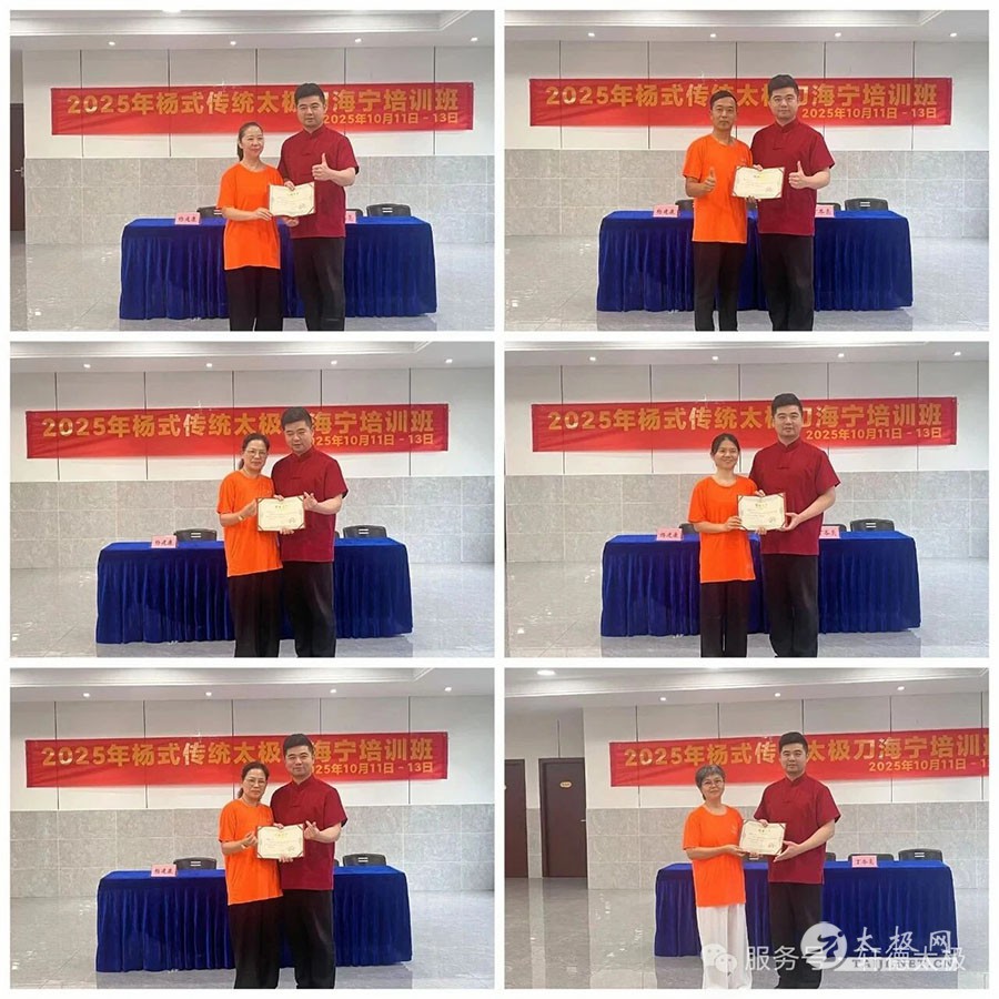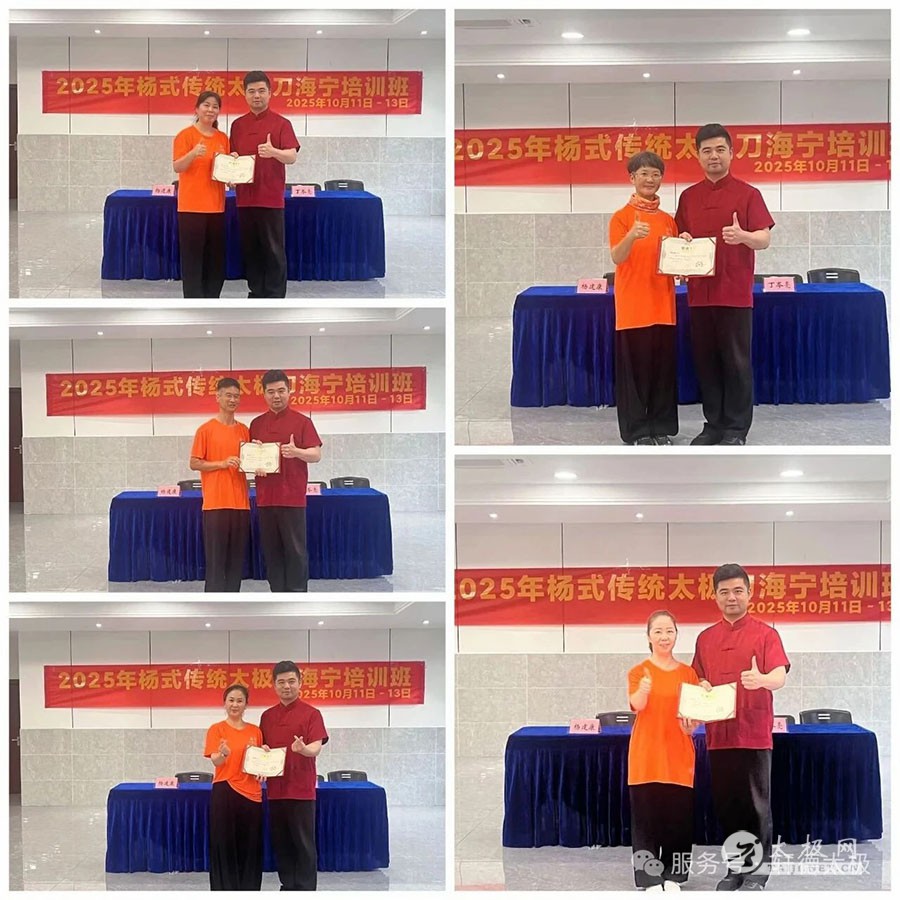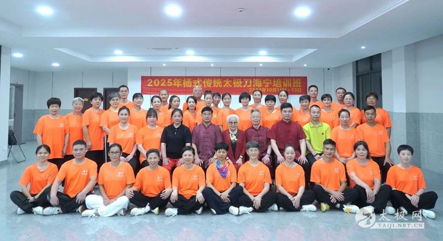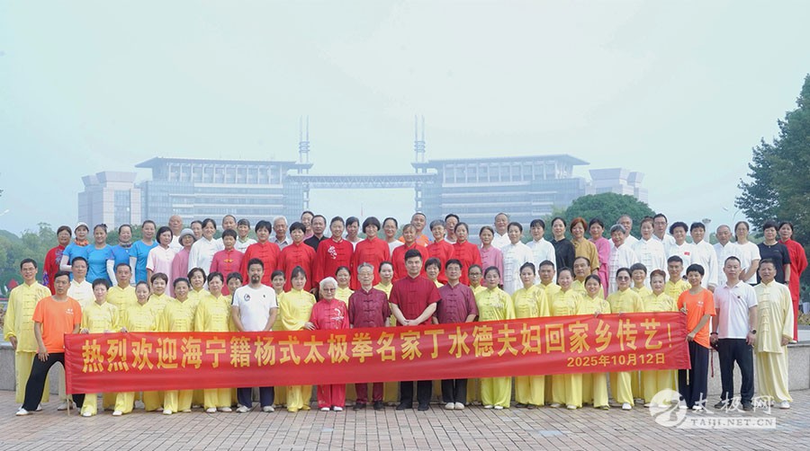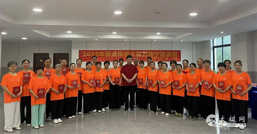 刀光闪烁,身形流转,一场太极与刀的完美邂逅,于10月11日至13日在浙江海宁上演。作为历史悠久的文化名城,海宁正悄然掀起传统杨式太极刀热潮。金秋十月,当地太极刀培训班如期开课,本次培训由海宁轩德太极俱乐部负责人杨建康发起,特邀轩德太极品牌主理人、杨式太极青年名家丁岑亮亲临授课;更有杨式太极名家、轩德太极品牌创始人丁水德夫妇(二人皆 96 岁高龄)及丁水德弟子丁晓洁、杨来宝共同莅临,为俱乐部全体学友提供了难得的学习提升机会。 欢迎晚宴上,海宁市武术协会主席郭军勇,嘉兴市武术协会副主席徐福高亲临现场祝贺