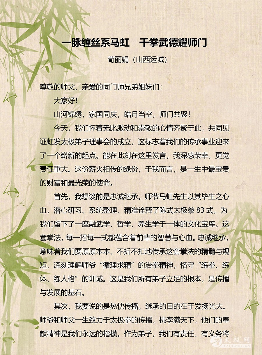 《水调歌头·虹发太极师门交流》 曙照拳旗动, 少长聚石门。 虹发同脉, 百侣白衣接晴暾。 刀起秋风落月, 剑啸清霜飞电, 拳影写乾坤。 师语千钧重, 弟子共铭恩。 童步稳,壮势阔,老姿尊。 同台一笑,万国和气此中生。 且把国粹远播, 任他岁月更迭, 薪火自长存。 来日再相会, 拳意满乾坤。 10月1日下午,虹发太极拳弟子理事会成立大会后,2025年虹发太极师门交流活动在石家庄阳光格瑞酒店举行。百余名虹发弟子以拳会师,以心立规。 杨合发先生展示陈氏太极拳