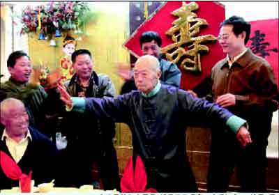 老寿星练起太极拳,博得满堂喝彩 都说这练太极能强身健体,延年益寿,这不,李老就是一活生生的例子。昨日,西安市太极拳协会的李应聘老人百岁寿诞,百余名弟子欢聚一堂为其庆祝。 李老昨日一身蓝色练功服,鹤发童颜,精神矍铄,在徒子徒孙的呼唤声中,李老一个“六封四闭”,动作灵活飘逸又力道十足。这外行看热闹,内行看门道,在座可是内行多多,就这一个动作,赢来现场一片掌声。
