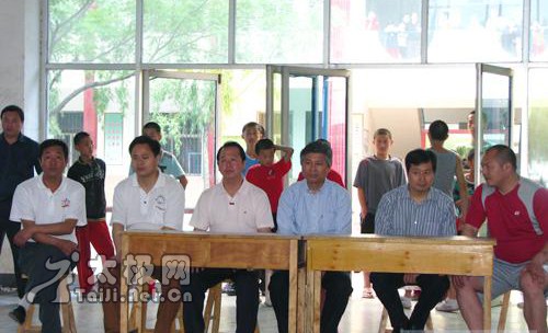 应温县体育局局长宋明军之邀,西安体育学院武术系主任陈亚斌在陕西省武术运动管理中心社会部部长肖关纪、陕西省武术协会副秘书长吴颖锋的陪同下,5月9日莅临武术之乡——河南省温县考察武术生源状况。 温县是全国首批武术之乡,太极拳发源地,习武人数众多,太极拳优秀人才出路问题,一直是制约太极拳人才发展的瓶颈。今年以来,温县体育局通过牵线搭桥,相继和河南大学体育学院、洛阳师范学院达成协议,为高校输送优秀武术人才建立了培训基地。温县体育局局长宋明军、武术科科长王东方、陈家沟太极拳推广中心执行主任陈皂罗、副主任张福旺、王战军、和式太极名家和有禄等陪同客人考察陈家沟武术院,并观看了陈家沟武术院学生太极拳套路、器械及推手表演。 陈家沟武术院执行院长王战军向陈亚斌主任、肖关纪部长介绍学校概况 在陈家沟武术院观看太极拳表演(左起):陈皂罗、吴颖锋、肖关纪、陈亚斌、宋明军、王战军 与曾在陕西省散打队进修的樊帅鑫交流