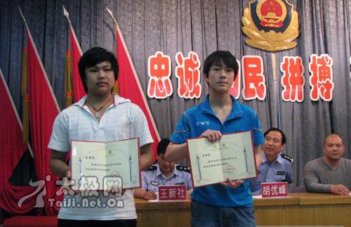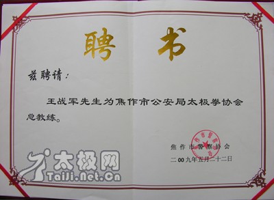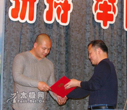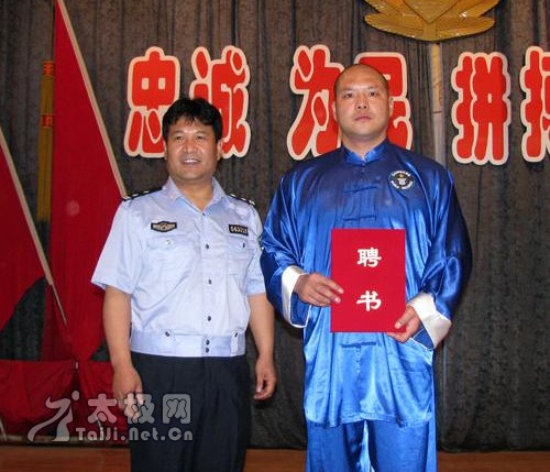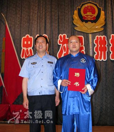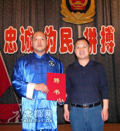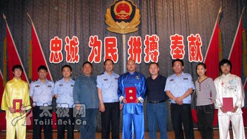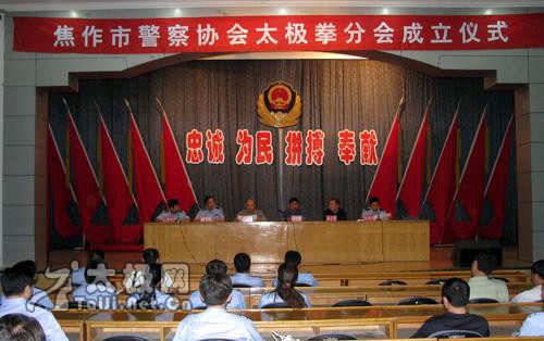 | 大会现场 5月22日下午,焦作市警察协会太极拳分会成立仪式在焦作市公安局大礼堂举行。太极名家、陈家沟太极拳“八大天王”之一、2008央视武林大会陈式太极拳年度总冠军、陈家沟武术院执行院长王战军被特聘为该协会太极拳总教练,王战军焦作弟子高强、陈和强被聘为焦作市警察协会太极拳分会教练。 焦作市公安局政治部副主任赵文征、监管支队政委胡优峰、中站分局政委杜保方、焦作市陈式太极拳协会会长闫文胜等出席了成立仪式并为王战军先生及其弟子颁发了聘书。仪式由焦作市警察协会秘书长王新社主持。据悉,该分会一成立,首期报名参加太极拳培训班的人数已达一百二十人之多。 成立仪式上,王战军弟子高强、陈和强、焦作市警察协会太极拳分会副秘书长石玉红分别作了陈式太极拳老架一、二路、竞赛套路56式的精彩表演,太极名家王战军展示了精深的太极内功——丹田弹重物3公斤。 焦作市公安局政治部副主任赵文征向王战军颁发聘书