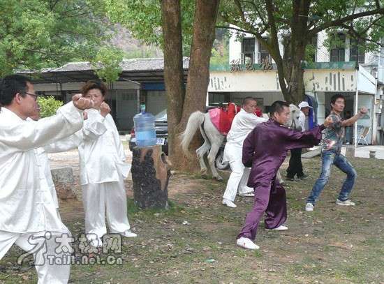 | 陈上党的拳姿引来了多门“长枪短炮” 2009年5月30日,温州市陈上党陈式太极养生会所的20多名会员,利用周末时间,相约驾车来到温州市较有名气的景区——仙岩寺旅游。 陈上党在示范讲解 带领学员们集体练拳 陈上党在给学员纠正动作 |