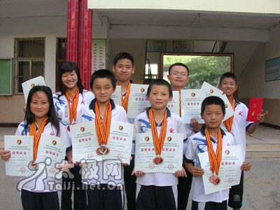 前排左起:雒燕、石章壁、邱治明、梁森 后排左起:毕鹤鸣 、闫云鹏 、杜宇、杜黎明 2009年6月18--22日,陈家沟武术院8名学生在教练李志强的带领下参加了在江苏太仓举办的第七届全国武术之乡武术套路比赛取得1金3银14铜共18枚奖牌的好成绩,受到县体育局领导的表彰。陈家沟武术院是代表武术之乡温县参加了此次比赛。  与体育局领导合影 全国农民武术比赛暨第七届全国武术之乡武术套路比赛由国家体育总局武术运动管理中心、江苏省体育局主办,太仓市政府承办。在为期三天的比赛里,来自全国23个省市区、57支代表队的近400名运动员参加了比赛。参赛运动员共参加了A、B、C、D四个组别的数十个武术项目的比赛,各种各样的传统拳、传统棍、传统剑、传统枪、传统刀法表演,让现场观众目不暇接。 毕鹤鸣 女子A组传统剑 一等奖 杜宇 男子B组传统剑 二等奖 石章壁 男子A组传统拳 二等奖 雒燕 女子A组传统剑 二等奖 杜黎明 男子B组传统拳 三等奖 杜宇 男子B组传统拳 三等奖 闫云鹏 男子A组传统拳 三等奖 梁森 男子A组传统拳 三等奖 邱治明 男子A组传统拳 三等奖 杜黎明 男子B组传统剑 三等奖 闫云鹏 男子A组传统剑 三等奖 梁森 男子A组传统剑 三等奖 石章壁 男子A组传统剑 三等奖 邱治明 男子A组传统剑 三等奖 雒燕 女子AB组传统拳 三等奖 毕鹤鸣 女子AB组传统拳 三等奖 集体对练 :杜黎明 石章壁 三等奖 杜黎明获体育道德风尚奖运动员 |