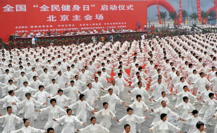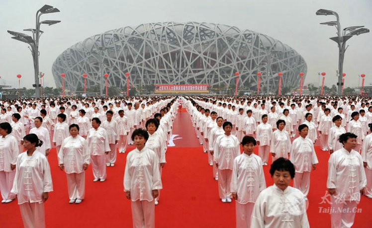 2009年8月8日,上午8时,“全国全民健身日”主会场启动仪式,在奥林匹克公园举行,4万名群众打太极拳,打破了吉尼斯世界纪录。在奥林匹克体育中心,同时进行“全民健身嘉年华”大型活动,免费向公众开放,参与群众多达10万人。国家体育总局局长刘鹏说:“这是党中央和国务院对我国全民健身事业的高度重视与亲切关怀,是党和政府关注民生的具体体现。新中国历史上第一个全国全民健身日的设立,绝对是一个里程碑,这既是对中华民族实现百年奥运梦想庄严时刻的最好纪念,也是进一步发挥体育的综合价值和社会功能的需要,意义深远。”在启动仪式上举行的太极拳表演,成为一道最亮丽的风景,吸引了全世界体育爱好者的目光,太极拳成为健身运动的一种时尚。目前,全世界习练太极拳的人数越来越多,太极拳已成为最广泛的体育健身运动。