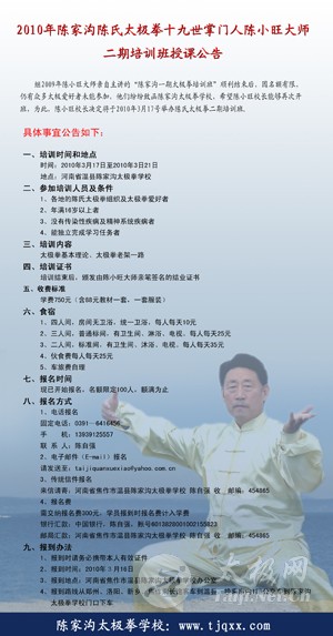 | 2010年陈家沟陈氏太极拳十九世掌门人陈小旺大师 二期培训班授课公告 继2009年陈小旺大师亲自主讲的“陈家沟一期太极拳培训班”顺利结束后,因名额有限,仍有众多太极爱好者未能参加,他们纷纷致函陈家沟太极拳学校,希望陈小旺校长能够再次开班,为此,陈小旺校长决定将于2010年3月15号举办陈氏太极拳二期培训班. 具体事宜公告如下: 一、培训时间和地点 时间:2010年3月15日至2010年3日20日 地点:河南省温县陈家沟太极拳学校 二、参加培训人员及条件 1、各地的陈氏太极拳组织及太极拳爱好者 2、年满16岁以上者 3、没有传染性疾病及精神系统疾病者 4、能独立完成学习任务者 三、培训内容 太极拳基本理论、太极拳老架一路 四、培训证书 培训结束后,颁发由陈小旺大师亲笔签名的结业证书 五、收费标准 学费750元(含88元教材一套,一套服装) 六、食宿 1、四人间,房间无卫浴,统一卫浴,每人每天10元 2、三人间,普通标间,有卫生间、淋浴、电视。每人每天25元 3、二人间,标准间,有卫生间、沐浴、电视。每人每天35元 4、伙食费每人每天25元 5、车旅费自理 七、报名时间 现已开始报名,名额限定100人,额满为止 八、报名方式 1、电话报名 固定电话:0391—6416456 手 机:13939125557 联 系 人:陈自强 2、电子邮件(E-mail)报名 请发送至:taijiquanxuexiao@yahoo.com.cn 3、传统信件报名 来信请寄:河南省焦作市温县陈家沟太极拳学校 陈自强 收 邮编:454865 4、报名费 需交纳报名费300元,学员报到时报名费计入学费 银行汇款:中国银行,陈自强,账号6013828001002155823 邮局汇款:河南省焦作市温县陈家沟太极拳学校 陈自强 收 邮编:454865 九、报到办法 1、报到时请务必携带本人有效证件 2、报到时间:2010年3月15日 3、报到地点:河南省焦作市温县陈家沟太极拳学校办公室 4、报到路线从郑州、洛阳、新乡、焦作乘长途客车到温县后换乘市内1路公交车到陈家沟太极拳学校门口下车 |