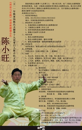 | 2011年陈家沟陈氏太极拳十九世掌门人陈小旺大师 《理论与实践》培训班授课公告 陈家沟陈氏太极拳十九世掌门人---陈小旺大师,应广大陈氏太极拳爱好者的热烈要求,为进一步提高太极爱好者对陈氏太极拳的认知,陈小旺大师将在2011年3月举办三期陈氏太极拳普及培训班之后,另开设陈氏太极拳老架一路招式解答与实战用法培训班. 具体事宜公告如下: 一、培训时间和地点 时间: 地点:河南省温县陈家沟太极拳学校 二、参加培训人员及条件 1、各地的陈氏太极拳组织及太极拳爱好者 2、习练陈氏太极拳三年以上者 3、没有传染性疾病及精神系统疾病者 4、能独立完成学习任务者 三、培训内容 1、陈氏太极拳理论阐述 2、陈氏太极拳无极桩、缠丝功讲解 3、陈氏太极拳老架一路的招势解答及实战应用 四、培训证书 培训结束后,颁发由陈小旺大师亲笔签名的结业证书 五、收费标准 学费2150元(含88元教材一套,一套服装) 六、食宿 1、四人间,房间无卫浴,统一卫浴,每人每天10元 2、三人间,普通标间,有卫生间、淋浴、电视。每人每天25元 3、二人间,标准间,有卫生间、淋浴、电视。每人每天35元 4、伙食费每人每天25元 5、车旅费自理 七、报名时间 现已开始报名,名额限定40人,额满为止 八、报名方式 1、电话报名 固定电话:0391—6416456 手 机:13939125557 联 系 人:陈自强 2、电子邮件(E-mail)报名 请发送至:taijiquanxuexiao@yahoo.com.cn 3、传统信件报名 来信请寄:河南省焦作市温县陈家沟太极拳学校 陈自强 收 邮编:454865 4、报名费 需交纳报名费500元,学员报到时报名费计入学费 银行汇款:中国银行,陈自强,账号6013828001002155823 邮局汇款:河南省焦作市温县陈家沟太极拳学校 陈自强 收 邮编:454865 九、报到办法 1、报到时请务必携带本人有效证件 2、报到时间:2011年3月20号 3、报到地点:河南省焦作市温县陈家沟太极拳学校办公室 4、报到路线从郑州、洛阳、新乡、焦作 乘长途客车到温县后换乘1路公交车到陈家沟太极拳学校门口下车。