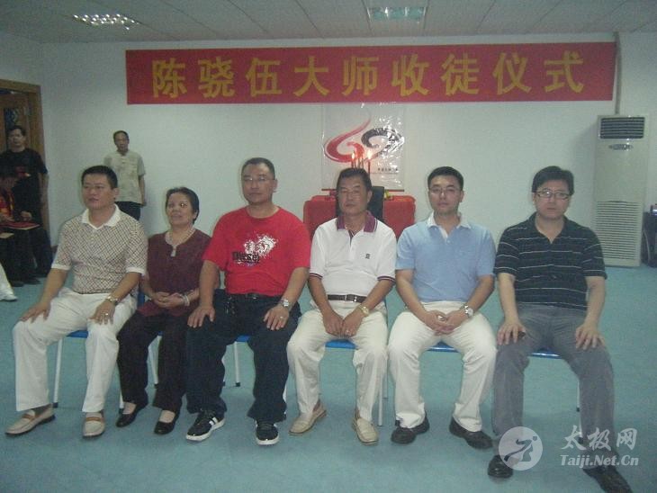 2010年5月26日在广东东莞市清溪槐圆太极拳馆槐圆太极拳广东培训基地,陈骁伍大师在这里举行了隆重的收徒仪式。来自河南安徽 湖南 香港 广东的李天敬 龚高 孙钱龙 骆成杰 陈金辉 魏志才六位武术爱好者拜入陈骁伍大师门下。    清溪镇商会创会会长,永远名誉会长,清溪太极拳研究会会长黄华精先生;清溪镇成教局主任殷志峰先生; 清溪镇文化中心主任 陈淦凡先生;东莞市智囊团法律咨询有限公司总经理,清溪太极拳研究会副会长王黎明先生参加了陈骁伍大师收徒仪式。  会长黄华精先生做来宾发言,对清溪太极拳的发展充满信心。参加仪式的还有清溪各界太极拳爱好者及陈骁伍先生已入门弟子。  来自河南三门峡的李天敬做弟子代表发言。李天敬先生1949年出生, 现年62岁,六八年随许昌拳师禄天华先生学习长拳,有黑虎拳,查拳,四把锤等,九零年习练太极拳,1991年参与组建三门峡习武健身友谊会任秘书长。2002年参加三门峡陈式太极拳研究会任副秘书长。李先生对自己拜入大师门下激动之情溢于言表,当场赋诗一首: 相识吾师已多年 经来结得太极缘 眼拙不见泰山高 五内感怀颜觉忏 六十学艺未为晚 随师再学六十年 探得太极阴阳理 “朝闻夕死”是心愿 |