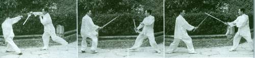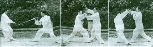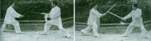 ——太极拳的武术属性研究之三 蒋家骏 太极拳跟其他很多的武术拳种一样,除拳术以外,还有器械的研习运用内容。早期的太极拳家们在拳术器械方面,大都能练就一身功夫。太极拳的器械内容,以刀枪剑棍为主,棍一般称为杆,且是长七、八尺的大杆。今以剑作为例子,分析陈氏太极剑的用法与武术的关系。 剑属于一种短兵器,便于携带,利于近战。平时所说的“短兵相接”,就是指用刀剑之类的兵器,在近距离内进行搏斗。 青铜铸剑,始于殷代和西周,到了春秋时期,铸剑的技术已经有了一定的水平。当时著名的铸剑工匠就有干将、莫邪、欧冶子,这三个人都生活在春秋时期的越国。 拳兴于齐,剑起于吴越,并不是说拳术和剑术,都是在那里发明创造的,而是说从记载来盾,拳与剑的活动,在这些地区出现得较早。著名女击剑家,就出生在越国,时称越女。春秋以后,历代著名的击剑家,多以学剑于越为荣,以示自己剑法精深。所以要追溯剑术法的属性,应从春秋战国时期开始,直至明清时代,其间我国的剑术法一直都很盛行。喜爱剑术的不仅有军中将士、武林侠客,而且有学者文人等,博及男女老幼。这就是以说明我国的剑术的属性自古就有武术和观赏表演之分,只是由于所处的历史时代不同,受生产力与生产关系的束缚和生活环境等因素的影响,剑术的属性各有侧重。明清之前至春秋战国、社会处于动荡不安的冷兵器时代,剑术是以武术属性为主,观赏表演为辅;而其后随着火器的演变,热兵器的不断发展,人们用剑防身格斗的意识逐渐消退,故其武术属性已多不被人们所重视,而观赏表演健身之风却日见盛行。纵观剑术的属性演变,它并不只是局限于某一个时期、某一武术宗派,再横向来全面分析整个中华传统武术的发展演变,又何尝不是如此呢? ![]() 自陈王庭创编太极剑之始,其宗旨亦是以技击为主,且采用了古老传统的击刺练习之法。不仅要熟练剑法、身法、步法、眼法、手法,达到剑身合一,而且对击、刺、格、洗等的实战练习要求也非常严格。诸如以香火头为目标击的是点,以悬挂的小圆环为目标刺的是环,劈的是线等。且击中有刺,格中有洗,其变化玄妙莫测,伤敌于无形之中。 随着社会的进步和需要,拳技之勇在战场和搏斗中的作用逐渐缩小,促使武术家们不得不重新考虑练习武术的目的和发展方向的问题。因此,太极拳家开始提出了:“详推用意终何在?益寿延年不老春”的口号,这是太极剑法从技击转向强身健体的启蒙思想。陈氏太极剑,既有继承传统的一面,也有创造发展的另一面。为了适应不同的学习对象,陈氏太极剑自然就有了技击和表演之分,随后又出现了其他多个流派。时至今日,就目前习练太极剑之芸芸众生,大都是取其姿势美观、动作优美,而只练套路不明剑法。传统剑术中的击、刺、格、洗等法早已被人们所遗落而尘封起来,对于传统太极粘剑的实战练习,问津者更是寥寥无几,剑法之精华也已到了濒临失传之机。 如今,每到一处武术健身活动场地,皆可以听到优美的旋律,看到翩翩起舞的剑穗,形如剑舞,煞是好看,很是引人注目。由此我们可以看到国家提倡全民健身确已起到了很好的积极的效果,不仅强身健体、益寿延年,同时也大大提高了人们生活的乐趣,一派其乐融融,安定团结的大好局面,这自然是可喜可贺的。但同时我们也应该从另一个侧面感知到传统武术在发扬传播过程中所存在的严重失败。从目前的许多大型太极剑的比赛中,只是以套路、花法取胜,评判标准皆以动作姿态舒展优美为准,毫不言剑法击、刺、格、洗之用。这是太极剑完全体育化的表现。就目前太极剑之现状,我们应辨证地去分析。一方面应该适应社会发展的需要,继续推崇其健身效应,另一方面也更应该提倡保留太极剑久已被人们所忽略的另一面——其武术属性(技击性),这也是挽救传播中国传统武术这一浩瀚工程中必不可缺少的重要内容。 我自幼随先师陈照丕(绩甫)习练陈氏太极剑,后又有幸受教于陈发科先生之爱女陈豫侠先生击刺之道,今已至花甲之年,对剑法技击之术略有所悟。笔者自知功力浅薄,不惴愚陋,谨就陈氏太极剑技击之法浅说一二,以此作抛砖引玉之举,如果能引出更多的美玉来,这将不仅仅是笔者一人之幸事矣。 ![]() 我国剑术有着悠久的历史,历代出现过无数的击剑名家,不能一一列举。各种门派都有剑法套路,然而剑的理论见诸经传者却十分稀少。偶有所见,亦只是只言半语,未能道出其中三昧。正如《陈氏拳械谱·说剑篇》所言:“剑法历来不易传授,如藏龙卧虎气势幽玄。”这是为什么呢?陈照丕先生曾言:“练剑须有身法、步法、手法极细艰难,因习者欲速,终难明理明法,何能深授”,由此可见习剑的人不能逐步细致地学练,以致无法深造,徒有“花法套路”而已,使一些剑法数传之后失其真谛。 武术家称剑为“短兵之帅”,形如飞凤,动若蛟龙;又说:“枪扎一线,剑走一圈”,意在形容练剑的人,动作起来,如飞鸟之展翅盘旋起舞,击刺发力又似出水的蛟龙变化莫测。 陈氏太极剑法与陈氏太极拳一样,精华所在,全在松圆转圈。怎样转圈呢?也就是以剑配合身法、步法、手法划一个圈,圈有顺逆,有大小,有上下、有左右、有前后、有有形、有无形,总之都离不开顺逆之圈,各种不同的圈,错综交叉配合于剑势中。 陈氏太极剑的妙用,在一转之间,极尽环绕之妙。一圈