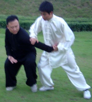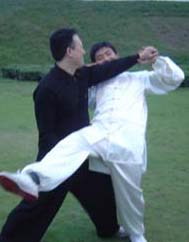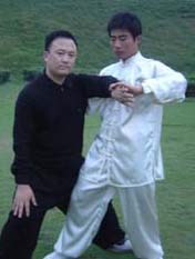 图1 现就中正在技击中的运用,举一例说明(白方:和东升 黑方:贾澎): 图1、乙方(白)拿住甲方(黑)左臂,用力向下采压,此时甲方胸腹微含,活腰松胯,听其力,彼有力 我亦有力,我力在先。彼无力我亦有力,意在彼先,将劲“灌”入身体,掤劲不丢。在运动中寻找机会战胜对方,借其势身体右领,重心略右移,实右虚左,舍己左臂从于对手,意要轻,身要灵,尤其使身法中正,这样劲方可领起,蓄劲而后发。 图2、甲方出左腿套封乙方身体侧中线,管住对手根节。同时左肩借力随势,由左走立圆轨迹向上引对手劲路,此时己之内劲锋藏于内,含而不露,因敌变化,如影随形,引其背、逆之时,即可“牵动四两拨千斤”,敌我力量对比也就彼削我涨了。 图3、甲方将身体借势领起左臂化开乙方的采拿,虚实变化,轻松柔和。轻灵之间左右两臂缠绕螺旋,圈圆劲顺。手臂转动时,立身始终中正,脚也随之摇动,达到一动上下齐动、周身相随一致的整体运动效果。甲方已经完全掌握主动权,此时立身中正,破彼之中心区域,沾连粘随,因人进退,虚实变化之间,左手领其力,引敌力于空处击之,或按、或拔根、或打横,我自从容,得心应手,随心所欲,劲力完整,如弹出膛,一触即发,威力无比,如虎搜山、似岳倒山催,对手唯束手耳! 总之,和式太极拳技击时的本能源于长期的行拳走架,不可机械、片面的理解。立于中正,守中、用中,听得准,化劲巧妙,拿劲稳,发劲及时,粘即是走,走也是粘,静观通变之道,意自心出,随手应物,因敌变化示神奇。耐心揣摩,只要方法正确,用工一日,技精一日,认真研习,达到“挨到何处何处击,周身无处不太极”的神明境界,恐怕也非难事,望学者详察! 作者简介:贾澎,1972年生,经济学硕士,郑州市武术协会副主席,太极名师和有禄、和定乾弟子,和式太极拳第七代正宗传人。 地址:河南省郑州市北环道与郑花路立交桥交叉口东路北 河南商都集团 邮编:450008 电话:0371---5550393 5220593 13837109593 email:hstjjp@371.net 网站:www.cctj.cn |