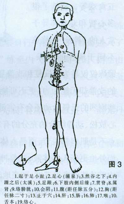 | 编者按 中医与武术同属中国传统文化,而且二者间有着紧密的联系,享誉世界的少林武术便强调武、医、禅的结合。现在有的武者只求武艺精,而忽略了相关文化的学习,结果导致功夫难有很大的提高。 本文作者在学医的同时勤习武功,并且将二者融会贯通。 本文谈的是开肾经以及相关捌劲的问题,为了让大家更好地理解和把握如何开肾经,我们不妨从小周天的气血运行谈起。 一年有二十四个节气,在二十四节气中气血循行是不一样的,是 与人体的六阴六阳相合、相应的。冬至起于一阳,在人体的会阴穴;大寒起于二阳,在命门穴;雨水起于三阳,在至阳穴:春分起于四阳,在夹脊穴;谷雨起于五阳,在玉枕穴;小满起于六阳,在百会穴;夏至起于一阴,在祖窍穴;大暑起于二阴,在承桨穴;处暑起于三阴,在天突穴;秋分起于四阴,在膻中穴;霜降起于五阴,在丹田穴;小雪起于六阴,在气海穴。人体按以上顺序进行小周天的气血运行(图1)。当您了解了六阴六阳和小周天的气血运行路线之后,就不难理解按季节练功的重要性了。杨澄甫先生在《太极拳说·十要》中讲得很明白:“或疑不用力何以能长力?盖人身之有经络,如地之有沟壑,沟壑不塞而水行,经络不闭则气通。”所以,练拳必须先通经络,经络通畅就不会产生拙力,内劲自然顺达。在《精武》2003年第12期中,笔者谈了秋分练功通肺经的意义。同理,骨坚髓满就需要肾经通畅,而冬至前后便是开通肾经的最好季节。 开通肾经、打出强大淳厚掤劲最简单的办法是: 第一,每年冬至到来的时刻,您要提前一个半小时放松人静,慢而均匀地练习“搂膝拗步”。如果右腿在前,用意念以命门找右环跳穴,自然会感觉产生一种内动,产生出一种强大的掤劲(图2)。如果练拳时间超过三年(必须保证每天练拳三小时以上),慢慢地练搂膝拗步定式时,会感到掌心微微突起,这时微微扩胸,手’心便会产生麻胀的感觉,这就是血脉流之筋骨之中的感觉,您会觉得身松骨坚,体内舒服。 第二,就传统拳而言,必须练出松弹劲。要想练出松弹劲,必须用意念想脚踝部有一个弹簧。以吴氏传统拳83式为例,从白鹤亮翅开始,接练搂膝拗步,右肩与左胯合,右肘与左膝合,右手与左脚合(外三合);心与意合,意与气合,气与力合(内三合)。上举的右臂肘尖(少海穴),意感微与膻中穴相合,身体就会自然向下松沉,右手下落。再用右脚的抽丝劲把右手掌抽到右耳旁,左掌下按,左脚同时向前迈出一步,用腰把右手送向前,打出掤劲。要尾闾中正安舒,再松腰,意念突掌心。此时,感到手心麻胀,掤劲十足。 第三,合神。当少海穴与膻中穴微合时,要实腹空胸,含胸拔背,眼神内敛,打出的掤劲就会更强大淳厚。这是为什么呢? 1.意念突掌心气达四梢,节节贯穿,气势圆活,劲力淳厚,意想膻中穴,心胸开阔,动作圆活流畅。膻中穴,八卦属兑上缺,五行属金,属肺,主皮毛。:金生水,强大的捌劲就是母子相合的功力。2.命门穴,八卦是坎中满,属肾,主骨生精之所在,五行属水,劲是掤劲,天干壬癸,地支子丑,掤劲也叫北方壬癸水,方位正北,穴位命门,地支子丑相合,’肾经自然通畅,肾气自然旺盛,也就是“家合万事兴”的道理。年龄稍大一点的人,随着年龄的增长,肾气趋于不足,多做搂膝拗步,就会自然打开肾经,就能骨坚髓满,壮肾舒肝。如果有一定功夫的人,在冬至来临之前提前一个半小时站太极桩,同时按着肾经的循行路线想三遍,气血就会循经络自然运行。以下是肾经循行路线(图3,按序号顺序运行)。 每逢冬至,如果有时间,希望朋友们按以上所述练一下,会有很好的收效。在冬至前后三天练习,效果都是很明显的。 我的朋友有的练太极拳十几年,可是我与之一接手,便觉得他们身上一点掤劲也没有,有的虽然有掤劲,却感觉很弱。有位朋友说:“我练得很刻苦,很用功,每天站太极桩两个小时,为什么没有别人那样的掤劲功夫?”其实道理很简单,不明理,不懂练功方法,不会调整虚实转换是练不出功夫的。 太极拳不仅是拳脚功夫,而且是头脑、心灵中的功夫。要知道太极就是天地,太极就是阴阳,要和天地相合,和四时共鸣,要知道季节和人体经络有密切的联系。冬至一阳生,就容易打开肾经,肾经通畅,人就骨坚髓满,练出来的掤劲就特别松弹,结果便是腰松体健,这一点不可不知。