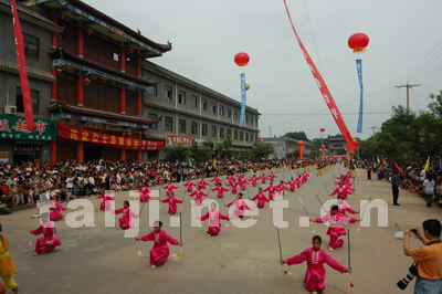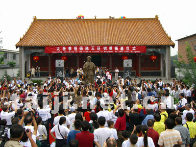 下午3点22分,满载着参加“一赛一节”的海内外宾朋的车队一驶进温县,便感受到热情好客的拳乡人浓浓的亲情。缤纷的彩带,喜庆的秧歌、激情的锣鼓、独具特色的太极拳表演……在温县县城黄河路、太极表周围等处,淳朴的温县人民身着节日的盛装,用最诚挚的方式欢迎远道而来的客人。 3点50分,当50辆大巴车驶上通往太极拳圣地的旅游公路时,车上1200多名宾朋的目光立刻被眼前正在进行的“万人太极拳演练”的宏大场面震撼了:在3公里长的旅游路上,近6000名身穿统一服装的中学生分队排开,正聚精会神地进行陈式太极拳老架一路表演,一招一式,传递着拳乡人以拳会友、以拳传情的美好情谊。赞叹、沉醉、仰慕……这短短1500米长的路程,成了不同肤色的人们心中最难忘的记忆。 大巴车缓缓进入陈家沟村,这天的陈家沟彩旗招展,彩球高悬,遍地风景,处处流淌着浓厚的太极神韵。特别是太极拳祖祠广场前的太极拳器械表演,更引得来宾们啧啧称赞。威猛异常的陈式太极双刀、轻灵飘逸的太极双剑、干净利落的太极枪、厚重威武的春秋大刀,让人目不暇接,眼花缭乱。 怀着激动和仰慕的心情,来宾们兴奋地步入太极祖祠,参加太极拳祖师陈王廷塑像揭幕仪式。国际武术联合会副主席雷蒙·史密斯先生,国际武术联合会秘书长、中国武术协会主席、国家体育总局武术管理中心主任王筱麟和市、县领导为陈王廷塑像揭幕。 温县县委书记董安民向来宾表示:作为太极拳发源地,温县在加快旅游设施建设的同时,将继续以“经济、环保、人文”的理念,高标准,严要求,搞好服务,争创国家AAA级景区,并加快太极拳申报世界非物质文化遗产的步伐,不断以新的面貌迎接海内外宾朋。 在新铸成的陈王廷全身铜像前,来宾们纷纷合影留念,随后又兴致勃勃地参观了拳谱堂、祖师殿、东西配殿、祖林和杨露禅学拳处等景点。踏着灰色石板,徜徉在古老的太极文化之间,感受着海纳百川之广博的太极拳无穷的魅力,人们的目光再次被眼前所有的一切深深吸引…… “太极拳不仅深受世界140个国家和地区的人们的喜爱,也改变了我的一生。我认为学会它将受益终生。终于见到陈家沟了,这将是我生命中最难忘的一天……”见到神往的陈家沟,新加坡太极拳爱好者林德兴先生激动得难于言表。 聚散终有时,两个多小时短暂而难忘的太极之旅,将在不同肤色的人心中,留下最美好的回忆。