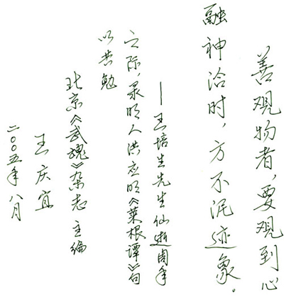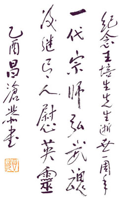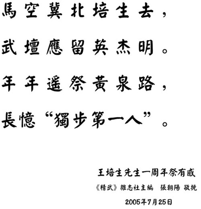 武术界的老领导:徐才先生,张耀庭先生,张山先生和刘哲先生为著名武术家王培生先生逝世一周年纪念活动题词之后,《中华武术》杂志老主编昌沧先生,《武魂》杂志老主编王庆宜先生,《武林》杂志老主编魏珉先生,《精武》杂志老主编张朝阳先生为著名武术家王培生先生逝世一周年纪念活动题了词。 《中华武术》杂志老主编昌沧先生的题词: 纪念王培生先生逝世一周年 一代宗师弘武德 后继有人慰英灵 乙酉 昌 沧 恭书  北京《武魂》杂志主编王庆宜先生的题词: 善观物者,要观到心 融神洽时,方不泥迹象 ——王培生先生仙逝周年之际 录明人洪应明《菜根谭》句 以共勉 北京《武魂》杂志主编王庆宜 二00五年 八月  《武林》杂志老主编魏珉先生的题词: 王培生大师逝世周年祭 宗师千古 道气长存 岁次乙酉 魏 珉 敬题  《精武》杂志老主编张朝阳先生的题词: 马空冀北培生去 武坛应留英杰明 年年遥祭黄泉路 长忆“独步第一人” 王培生先生一周年祭有感 《精武》杂志主编张朝阳 敬挽2005年7月25日  3.2005年9月11日(星期日),在“著名武术家王培生先生逝世一周年纪念活动”的同时,举行“武术大家王培生纪念光盘”正式出版发行的首发式。 北京吴式太极拳研究会“著名武术家王培生先生逝世一周年纪念活动”筹备组邀请王培生先生的生前友好、同门、弟子、学生、再传弟子和社会名流、武术爱好者9月11日参加纪念活动,共同缅怀王培生先师的业绩,并进行研讨和交流。 |