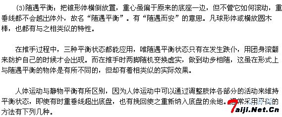 (2)不稳定平衡:凡出现不稳定平衡状态,除了通过动步相随以外,还可以运用旋转、弹跳、窜蹦等各种方法,使一脚或全身腾空,并争取在落地时,使自己的重垂线重新纳入底盘范围。