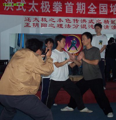 在学习休息的空隙,李驻军老师与学员及来访者进行了推手交流,切磋技艺。李驻军老师搭手将人发出丈外的太极功夫让学员大开眼界,李老师联系生活和劳动运动规律的生动讲解更让学员忘却了疲劳,提高了学习兴趣。大家都对洪式太极拳的精妙深感赞佩!整个学习都在欢快的气氛中进行,陪伴学员度过了一个难忘的国庆长假! 10月6日上午,李驻军老师主持召开了一个学习总结研讨会,大家讨论热烈,就洪式太极拳的特点、健身作用、技击效果发表了自己的见解,在会议上大家纷纷就如何更好地推广洪式太极拳这一科学实用的拳法献计献策。大家一致认为,这么好的拳法应该让更多的人了解她、学习她、研究她。李驻军老师也表示,以后每年的“五.一”、“十.一”都将举办洪式太极拳、推手培训班,并组织专门的工作人员班子,为学员的生活学习提供帮助。 座谈会上,曾经跟随国内多位名家学习过,今年53岁的陈先生激动地说:“可惜我认识洪式太极拳太晚了,认识李老师太晚了,洪式太极拳的科学性及李老师这种不保守的治学态度、合理的教学方法是我从没有见过的。今后我会将所有的精力用到练习和研究洪式太极拳上,为洪式太极拳的发扬光大奉献自己的力量!”李驻军老师也幽默地回复陈先生说:“陈先生学习了洪式太极拳等于进入了“第二青春期”,是武学的青春期,希望洪式太极拳使您青春焕发,保您寿康的同时让您的武学水平得到迅速提高。”