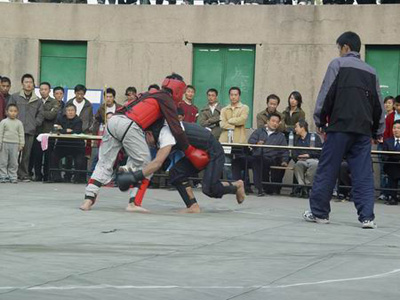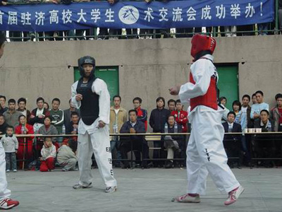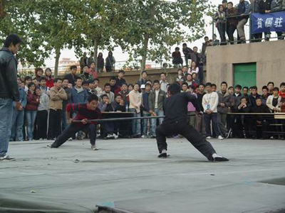 这次大会进行了传统武术套路、太极拳、自选拳、刀、剑的表演;散打、跆拳道的比赛。特别是太极拳推手比赛,山东劳动职业技术学院的邹拥龙、王涛利用太极拳刚柔相济、快慢相间、松活弹抖的技法,分别以17:0、10:1的成绩战胜对手、让大学生们感受到太极拳的技击魅力、赛后纷纷要求学习太极拳这一传统武术项目。 |