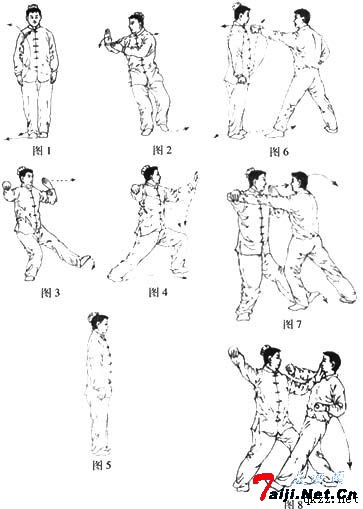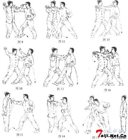 1、甲乙相遇对峙,甲止身垂手站立,以静制动,引乙左脚上步,出左拳抢攻甲中上盘空位,后发制人。日视乙攻势手(图6)。 2、甲在乙左拳攻击至身前时,右脚速向后撤步,左脚收移至右脚山侧,身势屈沉成丁步,避止乙攻势锋芒;同时,右f由身前上起内旋向右外拨带乙左腕臂内侧,左手同时上起,以掌腕外侧抵贴乙左肘内侧,左脚随即向乙裆间迈进;目视乙攻防手(图7)。 3、甲控制住乙攻势后,不容其换招连击或缓势解脱,右手以钩手扣栓住乙左拳腕,左脚钩套乙邻近腿踏实,身势前移成左弓步逼进乙身,左掌乘势前挥,迅猛推击乙中上盘要害空位,右手随势向前抖放,迫使乙失衡仰跌。目视乙中上盘(图8)。 4、若乙左拳腕在甲钩手扣拴之时用力抽脱,退步换式中㈩右拳连击甲中上盘欲挽回败势;甲则后发制人趋势不变,左掌臂迅速内旋向外拨带乙右拳臂内侧,同时,左脚向乙右脚外侧迈进,套抵乙右邻近腿;目视乙攻势手(图9)。  5、甲不容乙抽身换势,左脚速踏实钩套住乙右脚,身势前移成左弓步,左掌乘势迅猛推击乙中上盘要害空位,迫使乙失衡仰跌;目视乙中上盘(图10)。