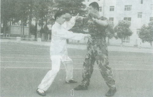 [page] 第一阶段:分脚、起手、下坐,我们把它理解为松静蓄气或准备作战状态。当对手突然用右拳向我面部进攻时,我通过胯转(在太极拳重心转换时几乎都是通过胯转,也就是我们常说的走裆劲)使重心移于右腿,左臂向前左掤开来拳,同时右掌跟发力击打对手腰腹部(图1)。  [练习要点]本动作是起势的开始动作,也是陈式太极拳的整套动作的开始。人们常说“一年之际在于春,一天之际在于晨”,我说“套路之际在于起势”。拳谚日: “行家一伸手,便知有没有。先看一步走,再看一伸手。”这就是说作为一个武者只要你架子一摆,你的功夫高低、身手如何、是进攻型还是防守型、身上有无破绽、破绽在哪,明眼人看一眼便知。由此可见起势的重要性。所以要想练好太极拳,不论是格斗训练或者是套路练习时都要慢慢体会动作要领,体会为什么要走裆劲、不走裆劲行不行,总结出自己的经验、教训、体会之后,你就会发觉突然跃上了一个新的台阶。当然,在练习太极拳时,并不是说动作越慢越好,而是通过慢动作练习找出动作的运劲方法、内气运行的路线,体会对手向我进攻时所使用的招式以及自己应对的办法。一切了然于胸后才能刚柔相济、快慢相间、随心所欲,达到练拳无人似有人、格斗有人似无人的境界。当然要达到这种境界极不容易,一个人能战斗就已经不易,而要想以弱胜强就更加难了。所以我们还要明白这个动作的棚劲与外家拳的不同之处:当对手突然用右拳向我面部进攻时,外家拳使用这个动作时左臂主要是小臂用力挂或格挡,右手进攻,而在太极拳中左臂棚劲主要是腰部发力,用身体整体协调力拨开对手,目的是让对手失去重心,使对手身体不经意间撞向我进攻的右手,使两力相撞,产生巨大杀伤力。
