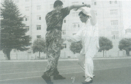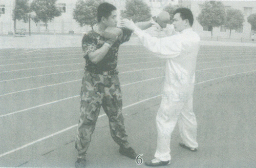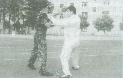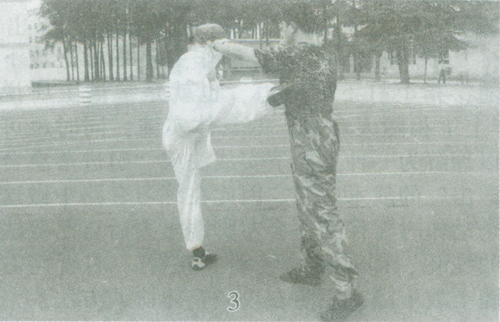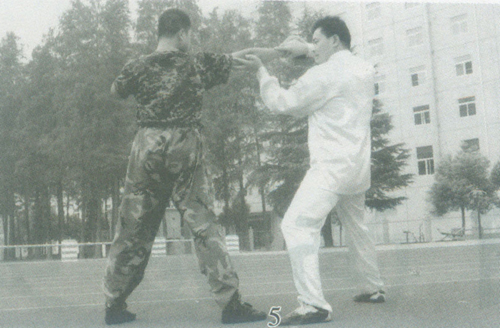 2,上动不停,对手右拳一击不中,又发左拳,这时我重心移于左腿,右臂拨开来拳,左臂顺势采劲砍击对手脖颈动脉(图2)。如对手格挡,我则起右腿抽击对手左肋部(图3);如对手闪避,我则重心右移起左鞭腿抽击对手左肋或踹击胸腹部(图4)。    [练习要点]本势动作主要练习自身左突右闪的整体协调能力。我本人在学习之始,也有老师讲此动作是叼托手。即对手用右拳向我进攻时我左手叼抓对手手腕,左手上托其肘(图5)。在经过多次反复练习后,这作动作做得都不成功。试想:在双方快速的击打对抗中,要想击中对手一拳或一腿都很困难,更何况是要抓住对方快速运动中的手腕.
