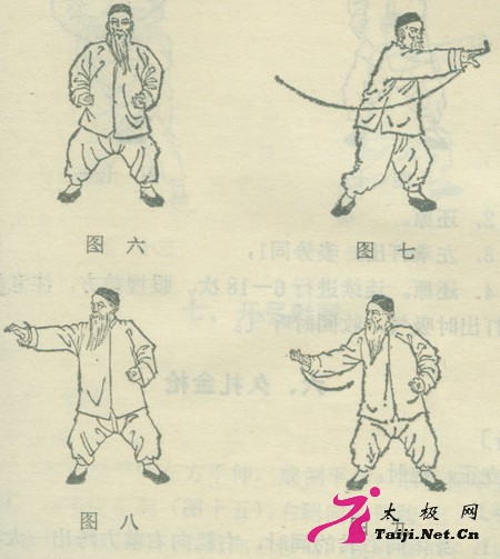 四、鹞鹰抓食 [预备] 1.立正,抱肘。 2.右腿向右侧横跨一大步,呈马步式,两脚分开的距离相当本人脚长的3倍,脚尖正对前方,膝尖与脚尖垂直,上身正直,臀部收敛,身体重心落于两腿之间(图六)。 [动作] 1.右拳变掌,手心向下,自右腰侧向左前方插出,手同时,前臂渐向内旋转,呈伏拳手掌向下(图十)(图十一)。 2.反掌手心向上,五指屈曲(图九)。收回右腰侧呈抱肘式。做时眼随手转。 3.左拳打出,姿势同1、2,方向相反。共进行6-12-24次。 4.还原。要求呼吸自然均匀,不用气。