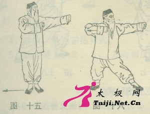 六、久扎金枪 [预备] 立正,抱肘。 [动作] 1.身体向右转的同时,右腿向右前方跨出一大步,脚尖向前,右腿屈膝下弯,大腿与地面呈水平,左腿伸直,左脚尖斜向前方,脚跟不离地,呈右弓步式(图十二)。 2.右手握拳向前方平冲出,右臂伸直,左手亦同时伸出,左肘微屈,两拳前后差一拳距离。目视前方。姿势摆定后,以均匀缓慢的速度呼吸3—9次(图十三)。 3.两拳收回腰间,仍呈抱肘式。 4.转体还原,呈立正抱肘式。 5.向相反方向进行,姿势同上(图十四)。反复做3—9次。   七、开弓射雕 [预备] 立正,抱肘。 [动作] 1.左手握拳向左方平伸,成侧平举,右手握拳置于左臂内侧,头转向左侧(图十五)。右腿向右侧跨出一大步,呈横裆步,与此同时.右臂向右移动,使右拳止干右朐前,目视左前方(图十六)。姿势摆定后,以均匀缓慢速度呼吸3—9次。 2.还原。 3.动作同①,方向相反。 4.还原。呈立正抱肘式。两侧交替做3—9次。  |