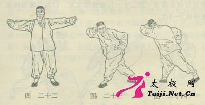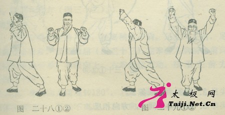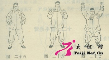 十、舟夫背纤 [预备] 立正,抱肘。 [动作] 1.右腿向右跨出一大步,两手握拳向左右分开呈侧平举(图二十二)。 2.身体向左旋转,头,腰与两脚均协同旋转。右手握拳沿水平方向自右至左划弧置于右耳前。左手收于左腰间抱肘。左足亦同时以足跟为轴,足尖离地,向左旋转(图二十三)。 3.还原,呈l姿势。 4.动作同1、2,方向相反(图二十四)。两侧交替做3—9次。呼吸均匀自然。  十一、力托千斤 [预备] 1.立正,抱肘。 2.右腿向右跨一大步(图二十五)。 [动作] 1.两拳自腰间向上翻起,高于肩平,拳眼向里(图二十六) 2.两臂伸直上举,两腿屈曲呈马步式(图二十七)。 3.两臂落下,两膝伸直还原至动作l。 4.还原至预备2。 5.动作同1。 6.两手握拳上翻不动,身体向右旋转,右腿屈曲,左腿伸直,足跟不离地,呈右弓步(图二十八①②)。 7.两手尽量举向上方,胸部挺起,两腿仍呈右弓步(图二十九①②)。 8.两臂落下,还原成动作6。 9.还原至预备2 10.动作同6、7、8,方向相反。 11.还原至预备2。 两侧交替做3—9次。上举时吸气,下落时呼气,其余自然呼吸。   |
