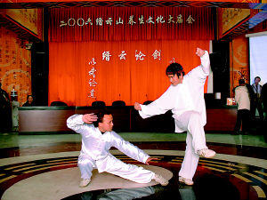 初一至初三论文,初四至初七说武,憾无相应比赛规则而使高手们无缘实战切磋,吸引游客千余 《缙云山发帖设擂比武》 本报讯 (记者 龙果)缙云山上春节七天又现“剑影刀光”,江湖八大门派现身白云观讲经堂,展开继去年春节后的第二次“缙云论剑”,纵论天下武林强身养生、竞技博击之事。昨天,在友好的气氛中,缙云山发帖设擂比武终于结束。 文讲火锅 初一,2006缙云山养生文化大庙会的主办方在讲经堂上拉起了“以武会友,以武论道”的布幅,地面上嵌砌了太极八卦的图形,各门各派掌门人一番豪言壮语,拉开了“缙云论剑”的帷幕。 此番论剑分文论、武论二项,初一至初三论文,初四至初七说武。主办方昨天称,春节七天有游客千余,观摩论剑之事。 虽说“内行讲门道,外行看热闹”,此番文论养生期间,偏有外行生出枝节,以“养生宜吃火锅否”,“冬日多穿衣还是少穿衣”为题,挑战各派掌门人。 是时,双方唇枪舌剑,妙语联珠。据旁观者云,其争斗之激烈,乃至双方面红耳赤,额头有汗珠渗出。当然,其结果自然是求同存异,各取所需。 武论技艺 初六下午2点,有少林、武当、峨嵋、太极诸高手论剑讲经堂,82岁北培区老人赵华先生一马当先,宝剑出鞘,舞起了少林昆吾剑,此老虽年事己高,但剑光霍霍,一路舞来,腾挪闪避,竟是威风凛凛,剑挟寒风。 又有武当残门高手出马,打出一拳煞是好看的拳脚,据称此拳中带有“残”字,暗含其功击实力,有令人残肢断腿的效果。 看起慢吞吞的陈式、武式太极拳刚柔相济,暗含螺旋之劲,打起来好看,旁观者不知厉害。本报记者于是亲身上前较技,猛扳陈式太极大师兄胡智手腕,孰料有20多年功力的老胡只是轻轻一拨,记者竟腾、腾、腾倒退三步,摔倒在地,着实领教了大师兄的功力。 渴望切磋 论剑中,记者提出“可否让陈式、武式太极一较高低”。此语赢得掌声一片。众武者议论纷纷,皆曰“当今国术除散打外尚无比赛规则,亦无擂可打,长此以往,其技击精华尽失,武术恐将成为‘舞术’”。于是,话题又围绕“武术如何走进比赛”而展开,成为本次论剑的一大论题。 官方质疑缙云论剑无资格定奥运规则 本报讯 (记者 黄晔 实习生 刘英)“‘缙云论剑’只是一次庙会形式的民间活动,没有资格制定中国武术比赛规则,更不用说制定奥运会武术比赛规则!”重庆市武术运动管理中心陈代玲昨天说。 陈代玲介绍,制定中国武术比赛规则要经过有关专家的研究、考察,拟成草稿,上报国家体育总局批准认证后,才能最后形成。而且,中国武术现在已经成为奥运会的一个比赛项目,比赛规则应由国际奥委会来制定。“‘缙云论剑’如果只热心讨论武术比赛规则,那对中国的武术事业还是有利的。” |