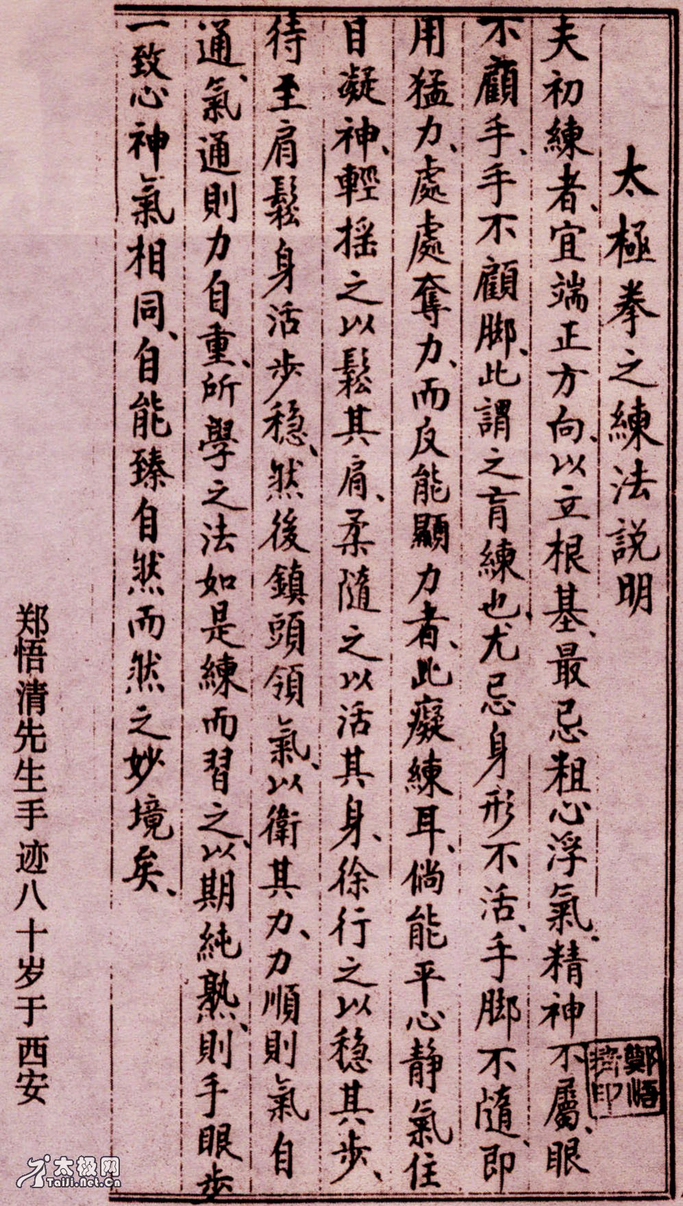 | 郑悟清(1895-1984),字凤臣,河南温县赵堡镇人,著名太极拳家。其拳技得本村老拳师和庆喜之真传,传统文化多受益于泗水安伯一。在安氏指导下,他将学习《易经》、《内经》、《论语》、《孟子》以及《老子》诸书的心得融化于太极拳中,所演拳势架高步活。速度均匀,柔软灵活,体现了“以柔为体,以柔为用,以柔克刚”的拳艺特点,技击养生兼而有之,遂盛行于西北数省,世称“和氏小架”。本期发表的《太极拳之统法说明》,为郑悟清先生八十岁时手书,由郑氏弟子原宝山先生提供。 大师云:夫初练者,宜端正方向,以立根基。最忌粗心浮气,精神不属,眼不顾手,手不顾脚,此谓之盲练也;尤忌身形不活,手脚不随即用猛力,处处夺力而反能显力者,此痴练耳。倘能平心静气,注目凝神,轻摇之以松其肩,柔随之以活其身,徐行之以稳其步,待至肩松身活步稳,然后镇头领气,以卫其力,力顺则气自通,气通则力自重。所学之法如是,练而习之,以期纯熟,则手眼步一致,心神气相同,自能臻自然而然之妙境矣。 |