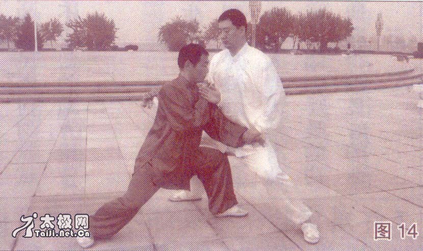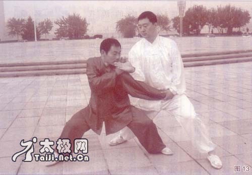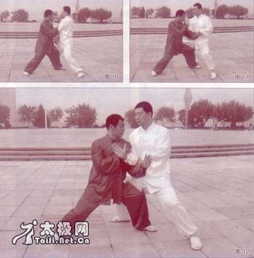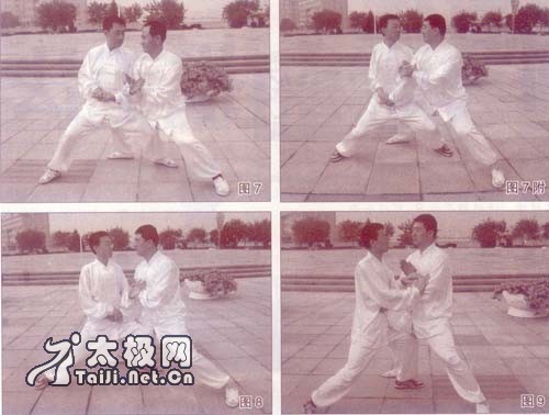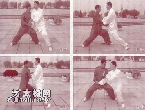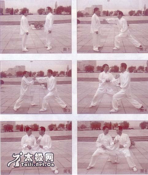 陈式太极拳推手是独具风格的传统推手方法,主要练习陈式太极拳的缠丝劲。动作虽少,但变化多端,充分体现了太极拳的掤、捋、挤、按、採、捌、肘、靠的基本技法。通过推手练习,可以全面提高拳术水平。此套推手法是由陈式十七代太极拳宗师陈发科先生所传,在太极大家洪均生老先生的继承发扬下.汇集以洪派太极拳现任掌门人李恩久先生为首的多位洪派太极拳名家的数十年经验总结,是现保留并继承的陈式太极拳唯一的一套正宗推手法。今介绍给广大爱好太极拳和太极拳推手的人们,不仅以此达到共同研究、共同提高的目的,从而在太极拳推向世界之时.尽一点微薄之力。同时,让更多的人了解我国传统武术的文化内涵。 1.甲乙双方对面而立(图1)。  2.甲方目视乙方身体左转,右足顺缠塌劲,拧腰转胯,左步逆缠向乙方进步,同时右手逆缠向乙方胸部出拳,左手顺缠自然合于胸前。要领;出拳要有逆缠的旋转力.肩要松,肘要沉,力点要准确(图2)。 3。乙方目视甲方,身体向右转,右脚顺缠外摆塌劲’左腿向前进步,右手顺缠沾接住甲方来手腕部外侧(图3)。 4.乙方左手同时逆缠合沉在甲方右肘外上侧。要领:要注意腰裆的转换(图4)。 5。甲方右手走空被乙方採住之时’右步随之塌住裆劲;进右肘攻击乙方腰肋。要领:甲方在进肘攻击乙时,要松肩沉肘(图5) 6.乙方继续向右顺缠,加大旋转的缠丝劲;并沉裆下塌,右手要顺缠探住甲:方的右腕,配合左手收肘同时加大腰部的缠丝。要领:左 手要虚领劲路,与右手配合形成下塌外碾之劲,劲力要顺达。注意:左手要有松沉之力,左臂要有挤靠力(图6) 7.甲方的右手被採挒后,甲立即塌劲松裆向右旋转成右偏马步化解乙方来力,右手领劲顺势向乙方中盘挤进并施用肘打、肩靠之法连环进 攻。要领:甲方右手要有钻头劲挤向乙方之右胯,同时依次以小臂挤进、肘打、肩靠,充分体现了太极拳的节节贯穿和“挨到何处何处击”的技击特点(图7,图7附)。  8.乙方为化解甲方的挤靠力,塌下裆劲变右转为左转"成左偏马步(图8)。要领:旋转力要配合下塌外碾,劲要随腰走,腰裆转换要灵活,肩 要松,肘要沉。 9,乙方在向左螺旋旋转的同时’左手逆缠甲方的左腕,右手顺缠领劲,向甲方的左肘关节处按出(图9)。 10.甲方的左肘要顺应来势,松沉随化"手指领劲,右手逆缠右肘向乙方的左上方转化"以化解乙方的来势(图10)。  11。甲方掤住乙方来劲,身体依次向右后、左方转化,腰裆形成螺旋转换。腿部变左顺右逆的步法,左手同时顺缠揉住乙方腕随之左引,右手同时逆缠从乙方左肘下粘转到乙方左臂上变顺缠成捋劲。要领:转换要圆和,右手逆缠要有沾粘劲"手随裆走,轻灵中要有掤力(图11) 12.甲方身体继续向左方加大旋转"左腿变顺缠,右腿逆缠成马步。要领:甲方左手採住乙方手腕要有向下的探按之劲,马步要沉稳,双脚要有向下的缠丝劲(图12) [page] 13.乙方为化解甲方的探捋,左臂松肩沉肘,右手探住甲右手腕,形成探捋。同时要开裆圆胯,左手向前方顺势旋转下沉成下塌外碾化解来力,钻头劲指向甲方的腰胯(图13)。  14。甲方受到乙方的下塌外碾的来力后,顺势加大缠度,腰裆继续左转,将乙方来势引进落空。(图14)。  1 5.乙方的劲力被甲弓1化’乙方顺势用小臂挤进,同时配合肘打、肩靠等法(图15)。  16.甲;b-运用缠丝向右转化,以右手逆缠化解乙方来势,左手顺缠捋乙方之左手成左偏马步,同时用按劲向乙方胸部按出。要领:右步注意塌劲.按劲发自腰身(图16)。 17.乙方松裆向左转化,右手棚住甲之来力成正手螺旋,左手成反手螺旋从甲右臂下转到其上方成捋手式(图17)。 18.乙方化解甲方按劲,松裆转胯,以探手捋劲来化解甲之来力(图18)。 如此左右反复练习;再由定步变活步进退练习,久之定会熟能生巧,搠、捋、挤、按、採、捌、肘、靠等自通矣。