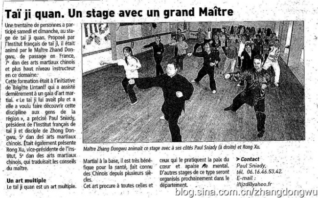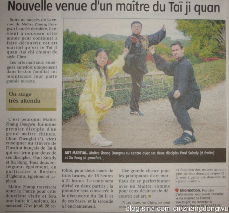 2010年10月19日至11月8日,法国张东武太极学院成功地邀请并组织陈氏太极拳名家张东武老师赴法国进行为期20多天的太极拳巡回讲学活动。此次巡回讲学由张东武老师亲自主讲,太极学院院长保罗全面组织,副院长徐蓉随行翻译。张东武老师一行所到之处,都在当地掀起了一阵中国太极文化的旋风。