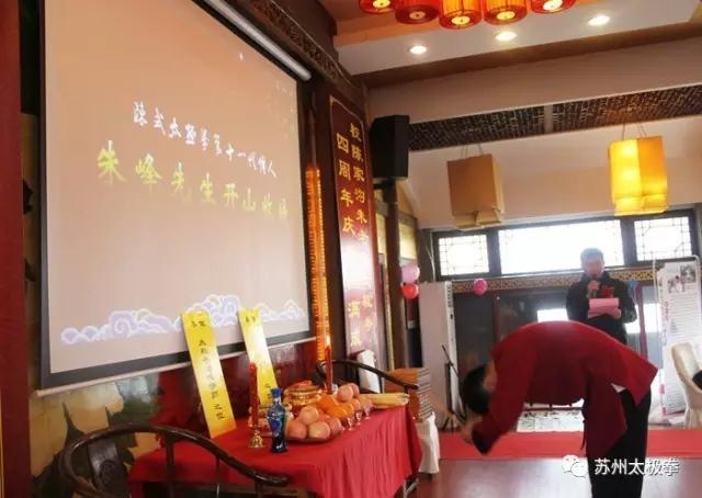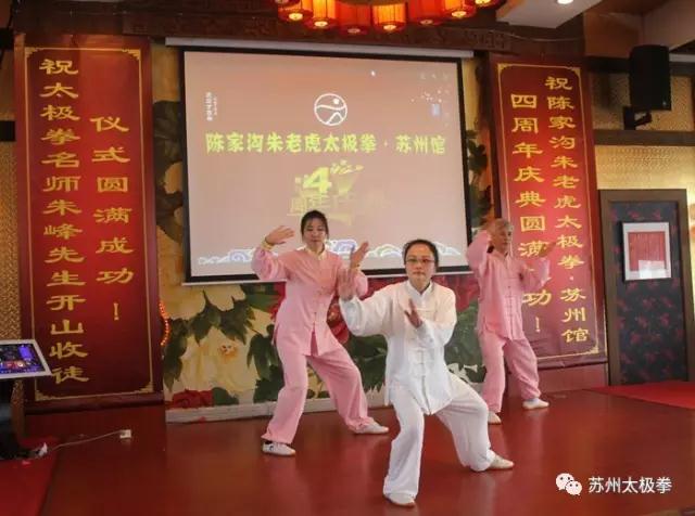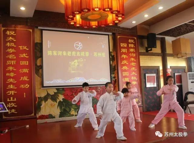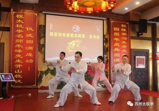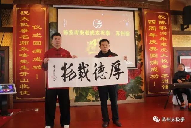 元月1日,陈家沟朱老虎太极拳苏州馆四周年庆典暨朱峰开山收徒仪式在美丽的金鸡湖畔凌轩阁大酒店隆重举行。陈家沟朱老虎太极拳功夫总院副院长朱堡垒,中国当代著名书法家王杰民,苏州市市容市政和历史街区景区管理局处长朱明华,苏州大学武术系副主任、硕士生导师张宗豪,苏州天园景观艺术工程有限公司董事长张平,苏州市徐州商会秘书长董双庆,翰泰工贸有限责任公司董事长胡银行,永康朱老虎太极拳法研究会会长任保才、主教练任保良,海宁朱老虎太极拳馆馆长辛红庆,陈氏太极拳第十一代传人朱路,贵州市朱老虎太极拳馆馆长唐笑笑,金芒果教育创始人王雨涵,鑫源古筝私塾耿琦、李岩以及来自永康、海宁的拳友和拳馆的学员们欢聚一堂,共同见证拳馆在苏州的发展历程。