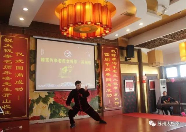 陈家沟朱老虎太极拳苏州馆成立于2012年,由陈氏太极拳第十一代传人、国际太极拳文化传播大使朱峰先生担任馆长兼总教练,拳馆历经四年的发展,在授课模式,壮大队伍,提高拳艺等方面逐步完善,使得陈氏太极拳这枝武术奇葩在苏州生根发芽。朱峰馆长在庆典仪式上首先致欢迎词,对各位领导、嘉宾、学员们长期关心和支持拳馆发展表示感谢!同时,感谢恩师朱老虎的悉心栽培,因为有他的严格要求和精神的指引,才有今天所取得的成绩。朱峰馆长表示,拳馆将继续本着传承太极拳文化的重任,团结社会各界,为太极拳的发展壮大而努力。