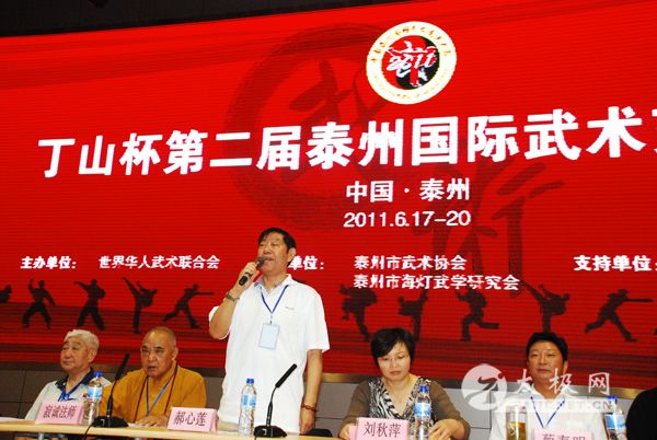 2011年6月17日-20日,由世界华人武术联合会主办,泰州市武术协会和泰州市海登武学研究会联合承办的“丁山杯”2011年第二届泰州国际武术交流大赛在泰州市医药城会展中心举行,来自全国各地的武术团体个人以及名家齐聚于此。