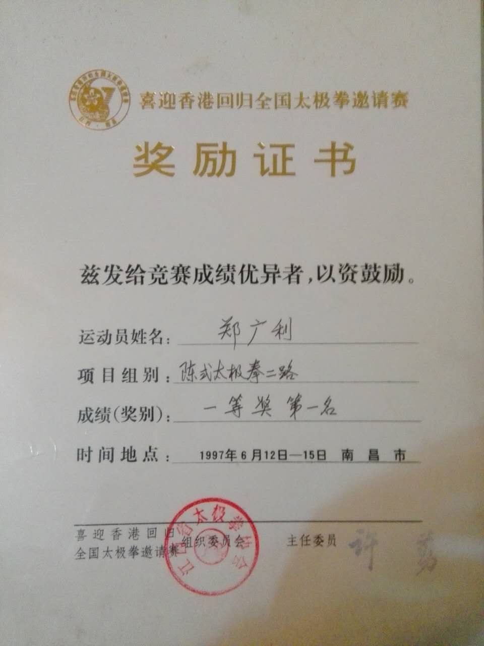 1997年曾参加南昌全国太极拳邀请赛,并获得金牌。