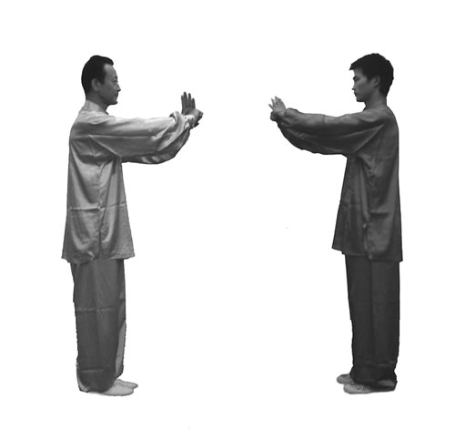 两人相对而立,距离约为1.5—2米,行抱拳礼(见图1,浅色衣者为甲,深色衣者为乙)。礼毕,两人双臂自然放松下垂于体侧,目视对方(见图2)。 行抱拳礼即是尊重对方又是庄重宣布严守武德,潜移默化修养心性,武术交手训练不可或缺。此时进入接手训练准备阶段。