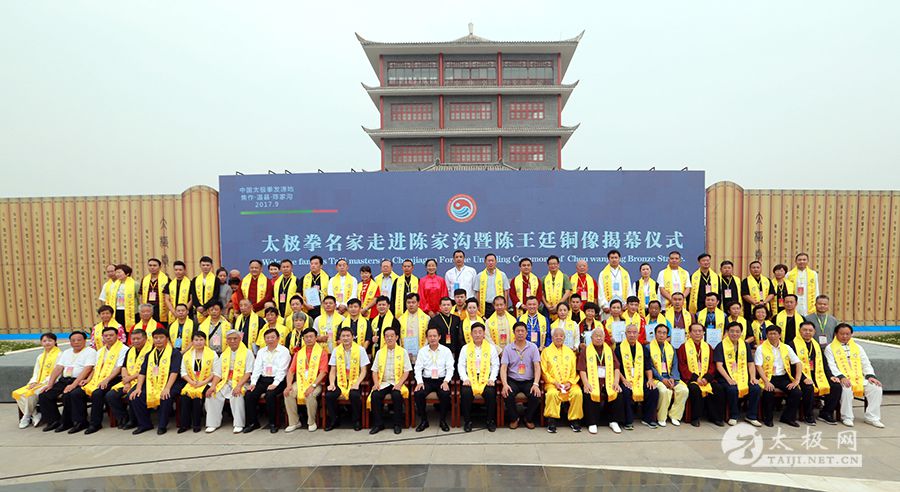 9月16日上午,太极拳名家走进陈家沟暨陈王廷铜像揭幕仪式在太极拳发源地陈家沟举行。太极拳六大流派代表性传承人,来自全国各地的世界太极拳名家,商界杰出代表,百城千万人太极拳展演活动中的主要演练城市优秀组织者,温县籍中青年优秀拳师,新闻、旅游媒体团,摄影采风团以及千余名国内外太极拳爱好者、“一赛一节”运动员等欢聚太极拳发源地,畅游东沟,表演交流,并共同参加太极始祖陈王廷铜像揭幕仪式。