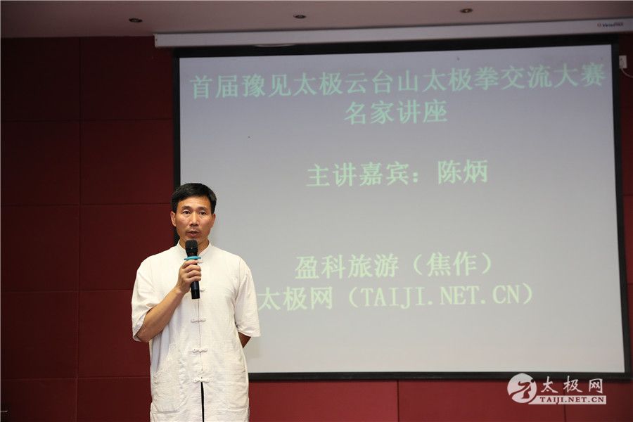 在首届“豫见太极”云台山太极拳交流大赛期间,为回馈广大太极拳爱好者的支持,组委会特邀请当代太极拳名师名家讲座授课,与五湖四海的拳友互动交流。6月16日晚,300多名拳友齐聚在银河花园酒店3楼会议室,聆听陈家沟国际太极院院长陈炳的讲座,与名师面对面交流互动。
