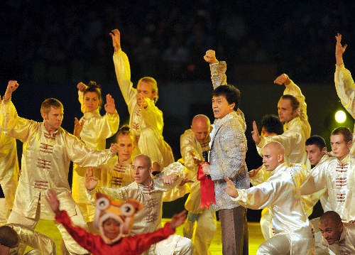 北京时间8月28日晚,2010年首届世界武搏运动会在国家体育馆举行开幕式,功夫明星成龙现场演唱武搏会主题歌《天行健》,而在展示唱功的同时还大秀“功夫”。图为武搏会开幕式上成龙的表演。