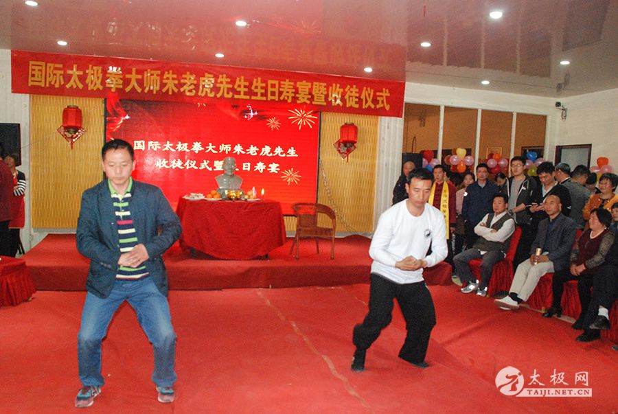 4月21日,国际太极拳大师、陈式太极拳第十代传人朱老虎生日寿宴暨收徒仪式于太极拳发源地温县举行。本次收徒仪式拜入朱老虎大师门下有宋海龙、菅鹏生、牛爱涛、赵进军、王晋庭、王建军、车晋波、成鹏、田明、张瑞云、樊志兴、焦建军、常毅、丁丽萍、常普光、田瑞林、徐静等十余位来自全国各地的优秀太极拳爱好者。