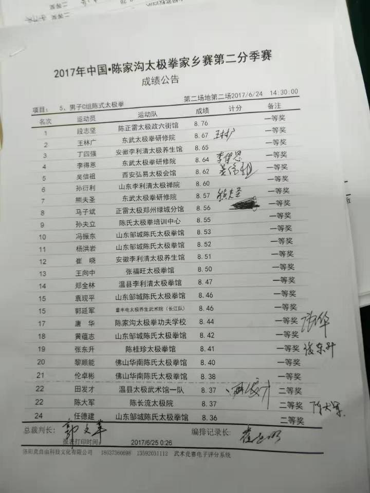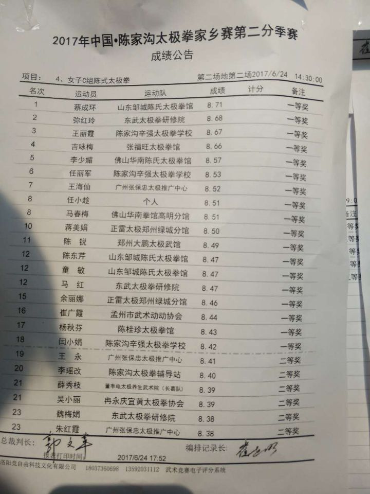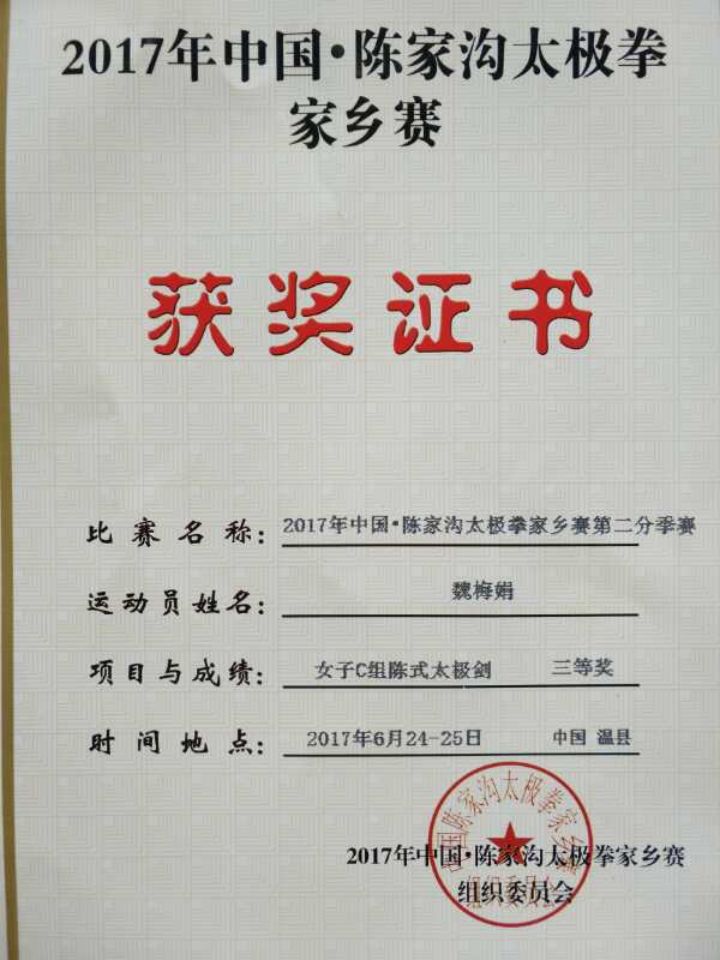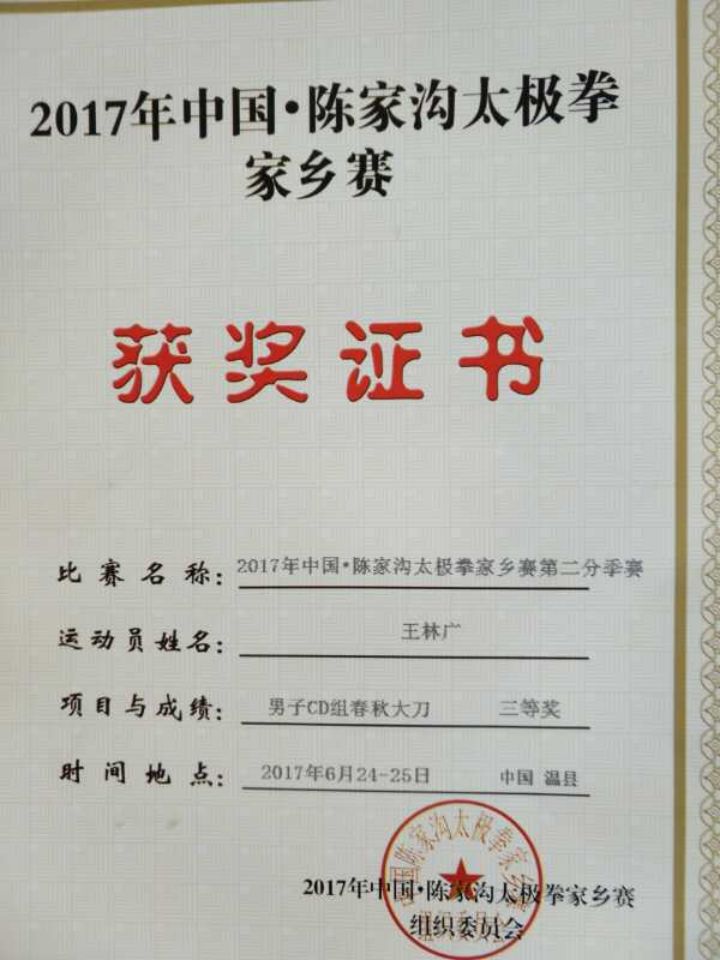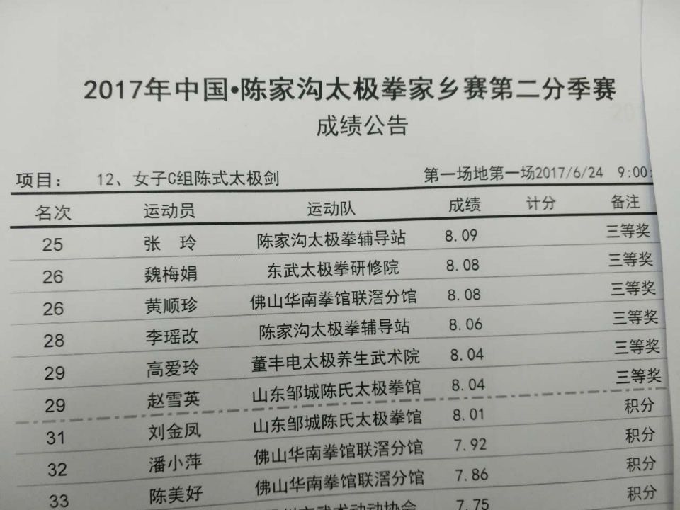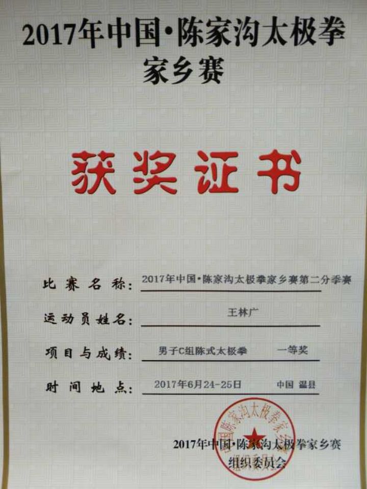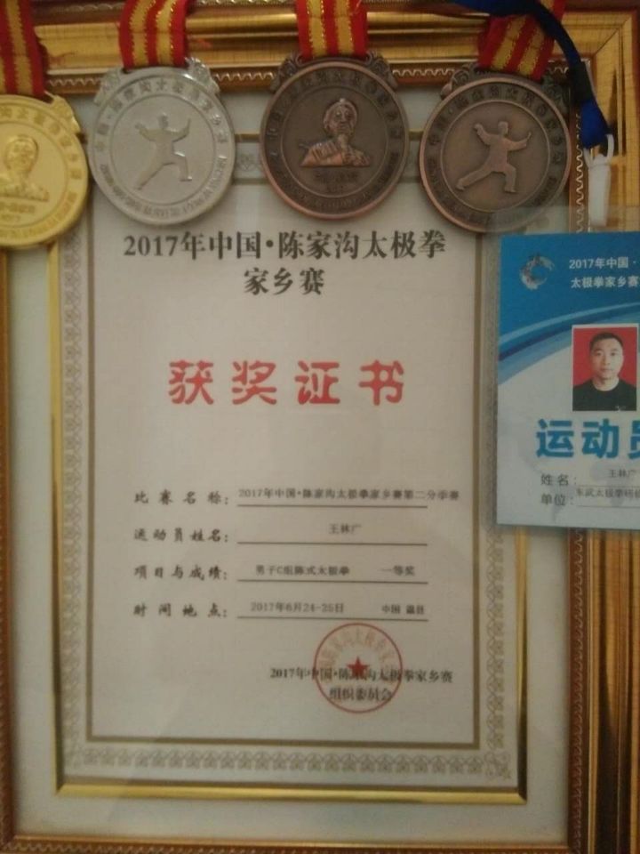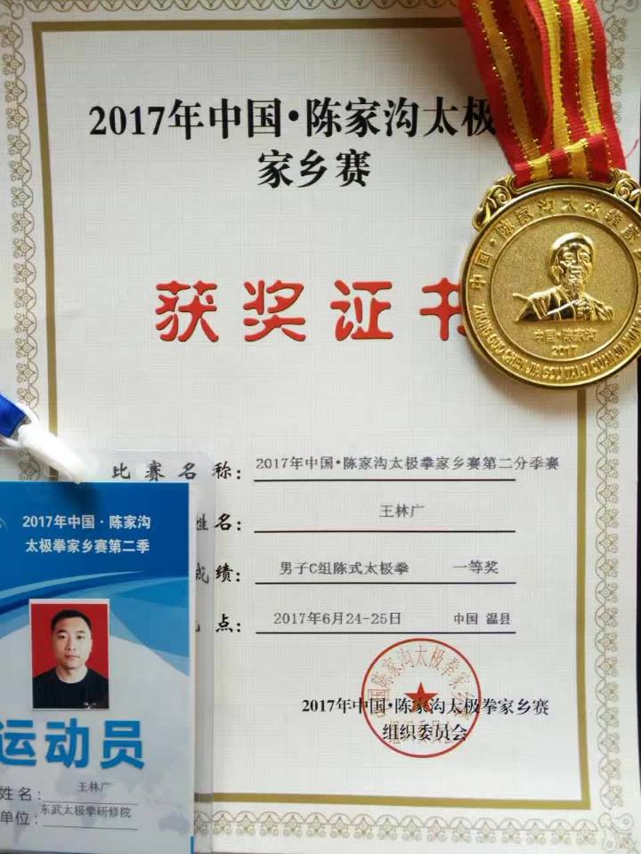中国陈家沟家乡赛昨天圆满结束,此次比赛规格高、竞争激烈,我们河南东武太极代表队不负师父厚望,拿到多枚金牌。莱芜市林广陈氏太极拳研究院院长王林广更是在c组139位选手中夺得金牌一等奖,名列前茅;学员魏梅娟成绩突出也获得银牌和铜牌,希望莱芜市林广陈氏太极拳研究院的所有学员继续努力。同时通过比赛,很高兴认识了来自全国各地的师兄弟们。