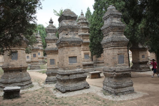 在少林寺西面不远处,静立着我国砖石雕刻艺术的殿堂——少林寺塔林。少林寺塔林现存有唐、五代、宋、金、元、明、清墓塔或佛塔246座,占地面积近两万平方米,是我国规模最大的一座古塔建筑群。塔林中的座座古塔,从大到小,从砖到石,从平面方形到六角形、八角形、圆形,从楼(亭)阁式到密檐式、覆钵式,从单檐式到多檐式,昭示着古代工匠高超的建筑水平。这些雕刻精湛的石构塔刹和绚丽多姿的砖雕图案,实为珍贵的砖石艺术佳品,是研究古代雕刻艺术不可多得的实物资料。