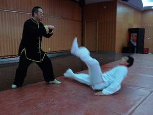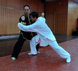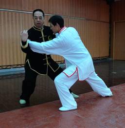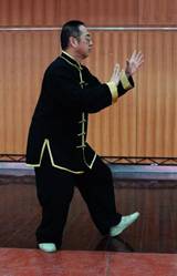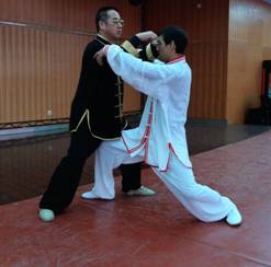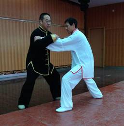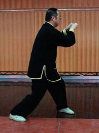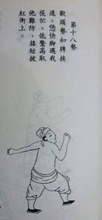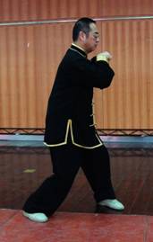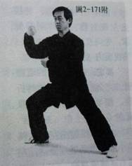 太极拳中的“兽头势”拳势,似陈氏太极拳独有。 考:“兽头势”来源于戚继光《纪效新书••拳经》第十八式:“兽头势如牌挨进,凭快脚遇我慌忙,低惊高取他难防,接短披红冲上。”(图1) 图1 陈氏两仪堂本“长拳谱”第七式为“兽头势如牌挨进”;“炮捶架子”第十七式为“兽头势”。太极拳十三势五套拳中,都没有“兽头势”拳势。 考:以下几本代表性著作,在“翻身二起脚”势后接 陈鑫《太极拳图说》 第三十势 “兽头势”(图2) 顾留馨、沈家桢《陈式太极拳》一路第三十九式 “兽头势”(图3) 陈小旺《世传陈式太极拳》 一路第三十五式 “护心拳”(图4) 陈正雷《陈式太极拳》 一路第三十五式 “护心拳”(图5) 洪均生《陈式太极拳实用拳法》一路第三十七式 “护心拳”(图6) 马 洪《陈式太极拳体用全书》一路第三十九式 “护心捶”(图7) 图2 图3 图4 图5 图6 图7 如上所知,几乎上世纪80年代以来出版的陈氏太极拳书籍一路(不论老架、新架),都没有“兽头势”的拳势,“翻身二起脚”后,直接“护心捶”拳势。只有1963年顾留馨、沈家桢的《陈式太极拳》一路第三十九式,是“兽头势”名称,但括弧说明:“又名护心捶或打虎式,”其实,从文字和拳架看还是“护心拳”。在陈式太极拳二路(炮捶)中,“裹鞭炮”拳势后都接“兽头势”拳势,唯洪均生的《陈式太极拳实用拳法》在“裹鞭炮”后的第三十一式称其为“手肘式”。 拳势的命名不外乎三种,象形的、说明动作的、说明作用的。“护心拳”是说明作用的,顾名思义是保护心胸的,所以洪均生大师说:“此式手法都是围绕胸部反复运动的,可以看出主要是保护胸肋,名为保护,十分恰当。”杨式、吴式太极拳将此拳势动作分开,称作左、右打虎式了。 陈式一路拳为何没有“兽头势”?或者“兽头势”即是“护心拳”?再或,陈鑫书中有“兽头势”,为何没有“护心拳”?而从拳架上看,又非“护心拳”架势。于此,究竟是一个拳势,还是两个拳势?不得其解。 不过,笔者以为,陈鑫保留了古拳谱“兽头势”拳势,这在以陈昭奎为拳架的顾留馨、沈家桢《陈式太极拳》书中还有痕迹,这是其一。其二,“兽头势”非“护心拳”,这不仅因为师父传与我的就是两个独立拳势,更因为“兽头势”有其独立含义。 首先,就“兽头势”拳势名称而言,实为象形。如陈鑫说,“其形凶如房上兽头,故名。”所谓“房上兽头”指的是龙生九子的第三子“嘲风”。其形如兽,平生好险又好望,所以将它放在楼阁殿堂屋脊翘檐上,象征着吉祥、美观和威严,而且还具有威慑妖魔、清除灾祸作用。这些走兽排列着单行队,挺立在楼阁殿堂屋脊翘檐的前端,走兽的领头是一位骑禽的“仙人”,后面依次为:龙、凤、狮子、天马、海马、狻猊、押鱼、獬豸、斗牛、行什。它们的排列有严格的等级规定,只有北京故宫的太和殿才能十样俱全,次要的殿堂则要相应减少(图8 )。太极拳的“兽头势”则取其形状而名之。 图8 太和殿屋脊“嘲风”走兽 其次,就“兽头势”练法而言,陈氏太极拳二路(炮捶)练法与技法大同小异,但一路的练法,笔者与社会上以及书中讲解的有较大区别;一是笔者所练的“兽头势”下接“护心捶”,是两个拳势;二是笔者“兽头势”非常象形,宛如“嘲风”走兽。而其它因与“护心捶”混为一势,没有了象形“兽头”的状态,只有“护心捶”的形象动作了【图9、图10】。 图9 兽头势图10 护心拳 虽然如此,但在练法和技法上多年来不得要领,近日偶然触发,有顿悟之感,试劲下来,颇有心得,觉得应该如此,现诠释如下,求教方家。 原势:接“翻身二起脚”后,双手握拳右旋双手捋收至腹部,同时右脚收于左脚边;身左旋双拳逆缠至胸部向前上方击出(图11—1、2、3、4)。 图11—1 图11—2 图11—3 图11—4 技法:我双拳下捋对方右拳,后回劲击打对方胸颈部。但多年试劲,总觉得不顺,效果不好。 现势:接翻身二起脚后,双手握拳顺缠、对开劲,同时身右旋,右脚虚步, 重心移至左脚;后双拳逆缠里裹向前上击出,同时身左旋,右脚蹬地(图12—1、2、3、4)。 图12—1 图12—2 图12—3 图12—4 技法:在推手或散放中,当对方抓住或按住你的双臂时,我双拳在对方两臂内顺缠,右拳沿对方左臂右旋滚动,亦可下压,同时左拳贴对方右臂滚动,身向右旋,将对方撕开,后突然左旋双拳逆缠裹劲,击打对方头部,同时右脚蹬地。试劲后觉得很顺畅、威力大、感觉好。当然,双拳在外圈同样可运用这一技法,只是双拳逆缠向对方手腕处裹劲后,向其胸部击发(图13—1、2、3、4)。 图13—1(双拳内圈顺缠滚动撕开)图13—2(双拳逆缠裹劲击头) 图13—3(双拳外圈顺缠滚动撕开)图13—4(双拳逆缠向内裹劲) 图13—5(双拳向其胸部击发) 笔者认为,这种练法和技法的“兽头势”,由形寓意,由意见形,形意相彰,浑然一体,不仅动作与名称相符,也是拳势和技法的统一。